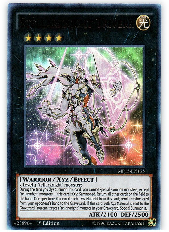 Stellarknight Triverr - MP15-EN165 - Ultra Rare - 1st Edition Image is a stock photo of the card. You will receive the card in Heavily Played condition Condition: Heavily Played ATK/DEF : 2100/2500 Ability : Attack #1 : Attack #2 : Attack #3 : Attribute : Light Card Number : MP15-EN165 Card Rules : Card Text : 3 Level 4 "tellarknight" monsters. During the turn you Xyz Summon this card, you cannot Special Summon monsters, except "tellarknight" monsters. If this card is Xyz Summoned: Return all other cards on the field to the hand. Once per turn: You can detach 1 Xyz Material from this card; send 1 random card from your opponent's hand to the Graveyard. If this card with Xyz Material is sent to the Graveyard: You can target 1 "tellarknight" monster in your Graveyard; Special Summon it. Card Type : EffectXyz Monster Edition : 1st Finish : HP : Illustrator : Level : 4 Manufacturer : Monster Type : Warrior Name : Stellarknight Triverr Passcode : 42589641 Pendulum Scale : Rarity : Ultra Rare Resistance : Retreat Cost : Set : 2018 Mega Tin Pack Stage : Weakness : Be sure to visit our store for a wide selection of your favorite cards! We are running specials RIGHT NOW!! Shipping Options: ~Ships in a regular white envelope with a stamp for FREE! (THERE IS NO TRACKING INFORMATION AVAILABLE FOR THE ABOVE METHOD. SHIPPING TIME IS 4-10 BUSINESS DAYS) ~Shipments are handled same or next business day. ~ FREE SHIPPING for each additional card, so shop around our store!