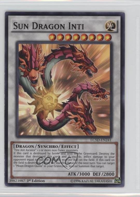 2014 Yu-Gi-Oh! Legendary Collection 5Ds - Mega-Pack [Base] - 1st Edition #LC5D-EN241 Sun Dragon Inti COMC Item: 29798519 - YuGiOh Card - Featuring Sun Dragon Inti Search for more: 2014 Yu-Gi-Oh! Legendary Collection 5Ds Search for more: 2014 Yu-Gi-Oh! Legendary Collection 5Ds - Mega-Pack [Base] - 1st Edition View all of our Listings Auctions Buy It Now About Us Located in the beautiful Pacific Northwest, COMC (Check Out My Cards) is the world's largest consignment service for trading card singles. More than 10,000 people have used our consignment service to list over 50 million trading cards. Find out how we can help you consign your items on eBay by contacting us through eBay messaging. COMC -- "The Safe & Easy Way to Buy & Sell" Raw Condition for Modern Cards Unless otherwise noted, raw modern cards are listed in Near Mint-Mint condition or better. A NM-MT card appears to be Mint at first glance, but upon closer inspection, may exhibit some of the following: minor print defects (e.g. roller marks, print line, dimple), minor scratches, slight edge wear, and slight corner wear. Centering is clearly visible in the images provided and does not factor into our condition assessment. Raw Condition for Vintage Cards Unless otherwise noted, raw vintage cards are listed in Excellent condition or better. An EX card may exhibit some of the following: minor rounding of corners, surface wear, print defects, light scratches, and slight edge wear/chipping. Centering is clearly visible in the images provided and does not factor into our condition assessment. Domestic Shipping Combined shipping for multiple items is available. To receive combined shipping, please ensure all desired items are in your eBay shopping cart before proceeding to checkout. eBay limits orders to 40 items per order. We automatically combine multiple orders placed on the same day. If you place multiple orders on the same day, please contact us to request a refund of applicable shipping costs. Signature confirmation may be required on invoices over $400. All cards are protected and shipped securely. International Shipping COMC offers eBay's International Shipping (EIS) for international orders under $2,500* (see country exceptions below). All duties and import fees are paid at checkout; in the rare event that there are additional import fees upon delivery, these are borne by the buyer. EIS packages route through a shipping hub in Erlanger, KY before shipping to their final destination. Please note that EIS does not allow for combined shipments. The shipping rates are determined by eBay and cannot be adjusted. *Maximum sale price exceptions: Colombia, Kuwait ($2,000); Taiwan ($1,539); Chile, Costa Rica, Guatemala, Honduras, Trinidad and Tobago ($1,000); Antigua and Barbuda, Aruba, Belize, Dominica, Grenada, Philippines, Saint Kitts and Nevis, Saint Lucia, Montserrat, Turks and Caicos Islands ($500); Dominican Republic, El Salvador ($200). Please request a shipping quote through eBay messaging for orders that exceed the maximum sale price supported by eBay's International Shipping. You will be responsible for all duties and import fees for international orders shipped outside the EIS. All cards are protected and shipped securely. Payment COMC does not accept offers on our cards through our eBay storefront. COMC utilizes eBay’s managed payments system. If you are experiencing difficulties making a payment, please contact eBay for assistance. Return Policy Returns are only accepted on the rare occasion the item is not as described. If you are making a return, please initiate the return process through eBay so a mailing label can be provided for you. Prior to listing, our expert team carefully assessed this item to represent it accurately. Please review the description and high-definition images prior to purchasing to ensure this item meets your satisfaction. We welcome you to contact us if you have further questions about this item. Trust and Integrity COMC carefully assesses each item consigned to us to prevent fraudulent items from entering the marketplace. If you believe an item offered on COMC may be fraudulent, please contact us with details so we can investigate the issue. Items we determine are outside our supported items policy may be removed. Last Modified: 6/3/2025 4:11:58 PM PDT