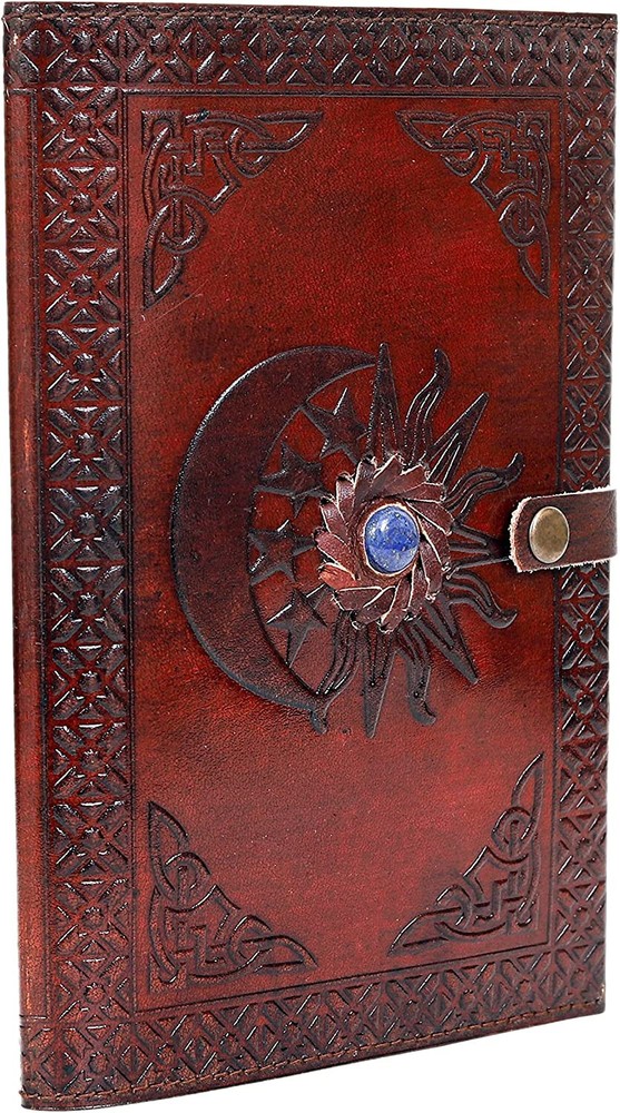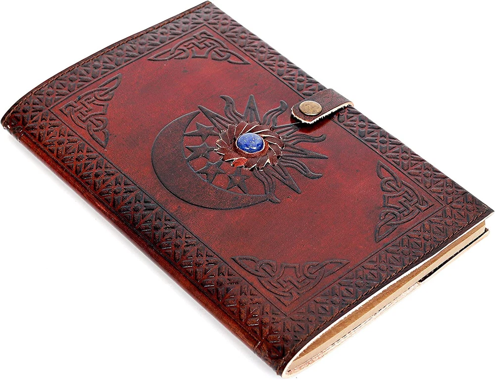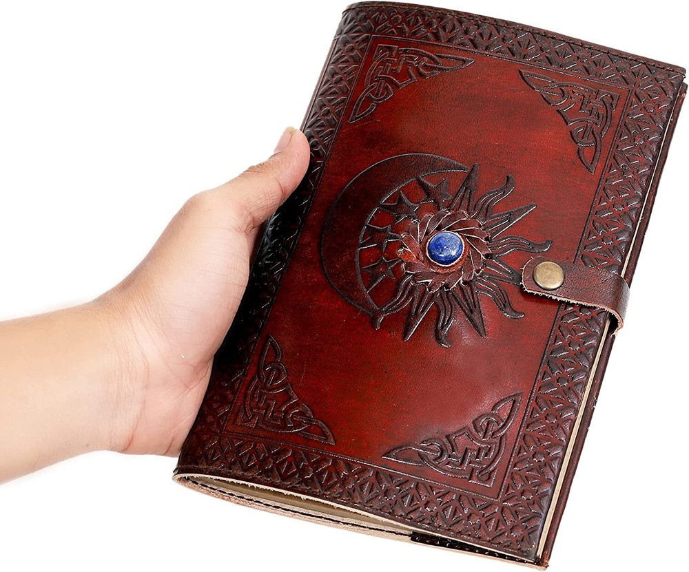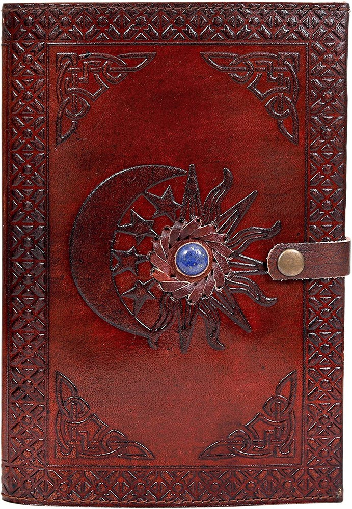 Leather Journal with Unlined Pages - SUN & MOON Blue Stone Leather Bound Writing Journal for Women & Men (7x5 in) Unlined Journals for Women, Leather Bound Notebook Journal & Diary, Embossed Stone Journal for Writing Handcrafted from genuine top grain leather: Each journal is specially designed and handmade from premium top grain leather. The artful design and hand stitching to create a timeless space for your thoughts Unlined paper: 180 pages of thick, natural 115GSM kraft paper. Perfect for use with many pen types. Thick paper prevents bleed through. Pages are Unlined with 5.5mm spacing. Note: page count is 180 pages, 90 sheets Tell your story: We designed this classic leather journal as a time capsule for your thoughts. Capture your important memories, accomplishments (and failures), life-changing moments and evolving dreams as a keepsake to reflect upon in years to come A special keepsake: Give your loved ones something truly special that will last for years to come! Great for a birthday, anniversary, or graduation