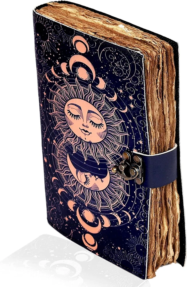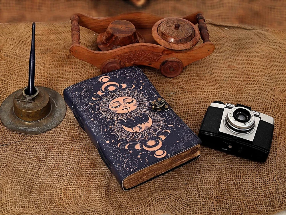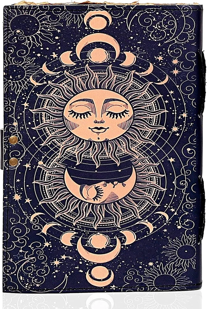 Imported. Handmade Leather Journal. Dimensions - 9 Inch ( Height ) x 2" Inch ( Width ) x 6" Inch ( Length ) Inches. Beautiful Sun & Moon Emboss Both Side ( Front and Back Side ). Original Antique Brass Clasp - Easy for Use. recycled handmade plain ( blank ) Deckle Edge paper used for Sketch, Writing. Sun & Moon Emboss journal, Vintage Journal, Sun moon Journal, Leather Sketchbook, Leather Notebook, Leather Journal for Men, Leather Journal for Women. sun moon journal, sun moon notebook, sun moon sketchbook, sun and moon journal, sun and moon notebook, sun and moon sketchbook, leather journal for men, leather journal for women, leather diary, leather vintage journal, vintage journal, vintage journal for men, handmade journal, leather handmade journal.