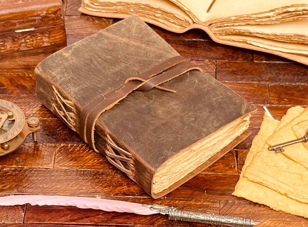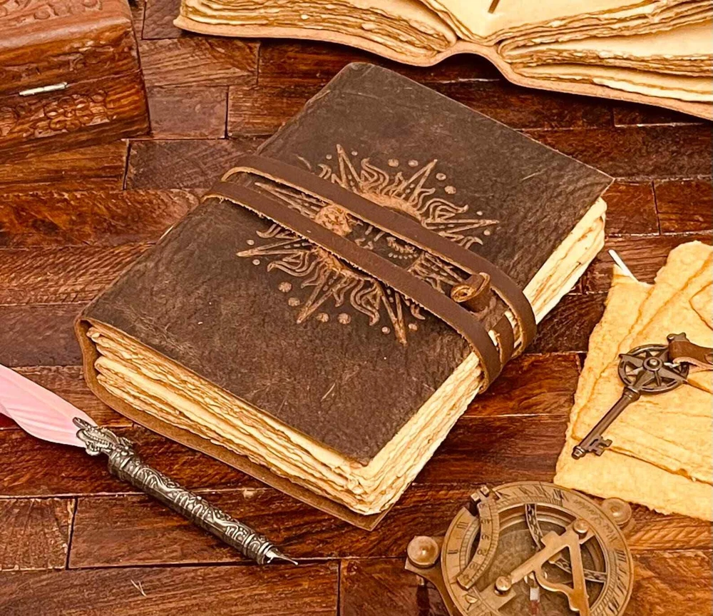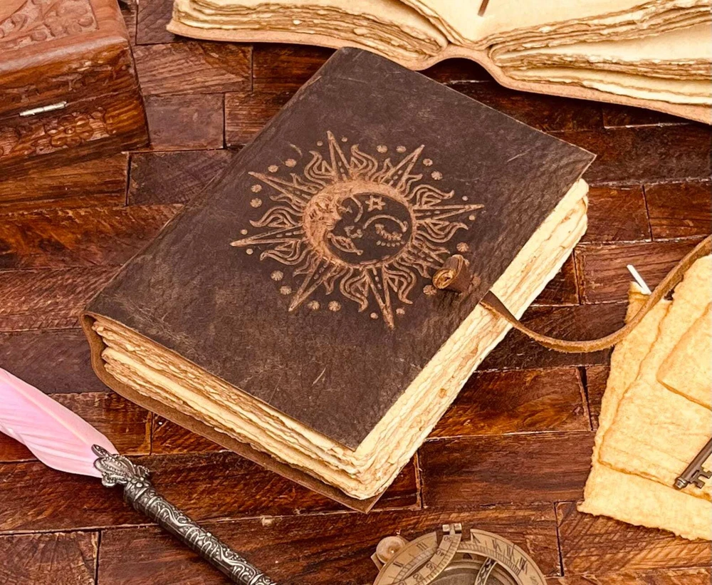 Sun and Moon Antique Vintage Leather bound Journal Handmade Deckle Paper - Sketchbook for women - Book of Shadows Travel Journal for gifts. "Handmade Leather Diary", "Vintage Style Notebook" • Embossed Journal • Genuine buffalo leather • Vintage deckle edge old paper • handmade rustic cotton paper ↪ Size - 7x5 Inches, 8x6 Inches ● Sun And moon - Leather journal witchcraft book of shadows notebook is made with 200 pages of Antique Paper which looks like it was pulled from history. You will fall in love with the the antique handmade cotton paper which is unique to our Vintage Journal Notebook. ● Sketch, Doodle, Write on your Leather Blank Spell Journal with a Calligraphy Pen Fountain Pen, Brush Pen, Ball Pen, Acrylic Colors, Watercolor and many more. We guarantee no bleed through.