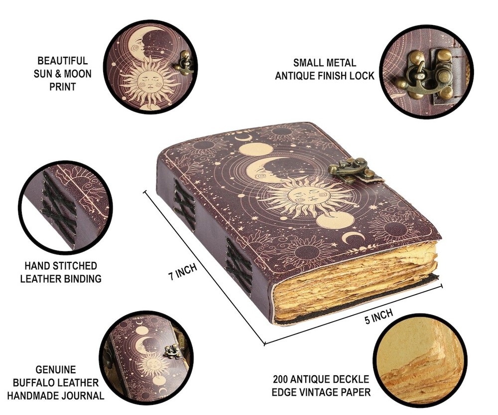 Print - Sun & Moon • vintage lock closer • Thick Genuine Leather • vintage deckle edge old paper • handmade rustic cotton paper • 100 Sheet (200 pages both side) ● Antique Paper - Vintage Journal is made of unique vintage paper which looks like it was pulled from history. You will love the old looking handmade cotton paper (200 pages) which is unique to our vintage journals. ● Sturdy Binding, Leather Wraparound - Sturdy hand stitched binding to make sure that no paper comes out loose. ● Use Any Kind Of Pen - Sketch, Doodle, Write on your journal notebook with a Calligraphy Pen Fountain Pen, Brush Pen, Ball Pen, Acrylic Colours, Watercolor and many more. ◆ {Multiple Uses} ● The vintage leather journal is a perfect sketchbook, drawing journal, great gift for man & woman, book of shadows, grimoire journal , wicca journal , calligraphy journal, story writing, scrapbook, art journal, leather sketchbook, travel journal, journals for women and many more.