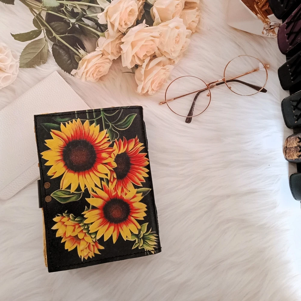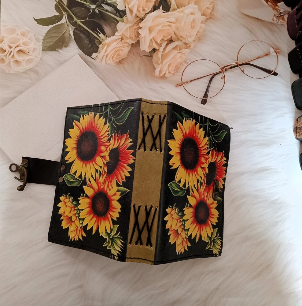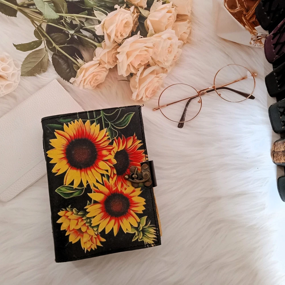 Sunflower Leather Journal, Sketchbook, Leather Dairy, Notebook, Wedding gift, Travel Journal, Dream Journal, Wedding Gift, Personalized Gift 1. This exquisite Sunflower Leather Journal is a must-have for anyone who appreciates fine craftsmanship and unique design. The black and yellow sunflower painted cover adds a touch of elegance and charm, making it a perfect accessory for those who love to jot down their thoughts, sketches, or dreams in style. 2. With 200 deckle pages, this journal provides ample space for all your creative endeavors, whether it be writing, drawing, or simply recording memories from your travels or daily life. The brass lock ensures that your thoughts and ideas are kept safe and secure, making it an ideal choice for those who value privacy and confidentiality. 3. This versatile journal can serve as a sketchbook, leather diary, notebook, or even a dream journal, allowing you to use it in a way that best suits your needs and preferences. It also makes for a thoughtful and personalized wedding gift, symbolizing new beginnings and the start of a beautiful journey together.