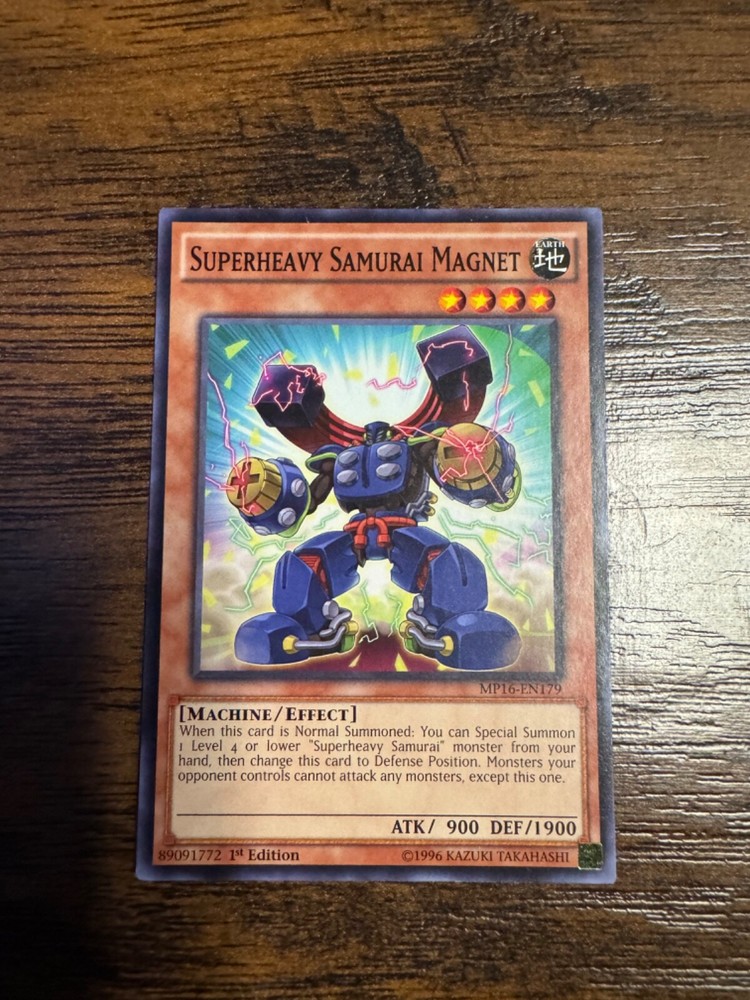This is a rare and highly sought-after Superheavy Samurai Magnet card from the 2016 Mega-Tins Mega Pack set. It features a powerful 900 attack and 1900 defense/toughness, making it a formidable addition to any Yu-Gi-Oh! TCG collection. The card is an effect type and has a card number of MP16-EN179. It is manufactured by Konami and comes in English language. The card is a 1st Edition and has a rarity of Common/Short Print. This card is perfect for collectors and players alike, and is sure to impress with its unique features. Don't miss out on the chance to add this card to your collection!