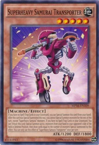 Superheavy Samurai Transporter - MP16-EN109 - Common - Unlimited Edition Image is a stock photo of the card. You will receive the card in Lightly Played condition Condition: Lightly Played ATK/DEF : 1200 / 1800 Attribute : EARTH Card Number : MP16-EN109 Card Rules : Card Text : If you have no Spell/Trap Cards in your Graveyard, you can Special Summon this card (from your hand). After this card was Special Summoned this way, you cannot Special Summon monsters for the rest of this turn, except "Superheavy Samurai" monsters. If you have no Spell/Trap Cards in your Graveyard: You can Tribute this card; Special Summon up to 2 monsters from your hand to your opponent's side of the field in Defense Position, then draw cards equal to the number of monsters Special Summoned by this effect. You can only use this effect of "Superheavy Samurai Transporter" once per turn. Card Type : Not Available Edition : Unlimited Level : 5 Monster Type : Machine / Effect Name : Superheavy Samurai Transporter Passcode : 41141943 Pendulum Scale : Rarity : Common Set : Be sure to visit our store for a wide selection of your favorite cards! We are running specials RIGHT NOW!! Shipping Options: ~Ships in a regular white envelope with a stamp for FREE! (THERE IS NO TRACKING INFORMATION AVAILABLE FOR THE ABOVE METHOD. SHIPPING TIME IS 4-10 BUSINESS DAYS) ~Shipments are handled same or next business day. ~ FREE SHIPPING for each additional card, so shop around our store!