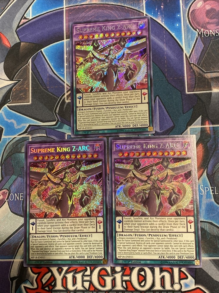 The "Supreme King Z-ARC" card is a Secret Rare card from the 2018 Mega-Tins Mega Pack of the Yu-Gi-Oh! TCG. This Fusion, Pendulum, and Effect Monster has an impressive Attack/Power and Defense/Toughness of 4000 each, making it a formidable Dragon-type card. Manufactured by Konami, this 1st Edition card is in English and belongs to the Dark attribute. It is a sought-after collectible for fans and players of the trading card game.