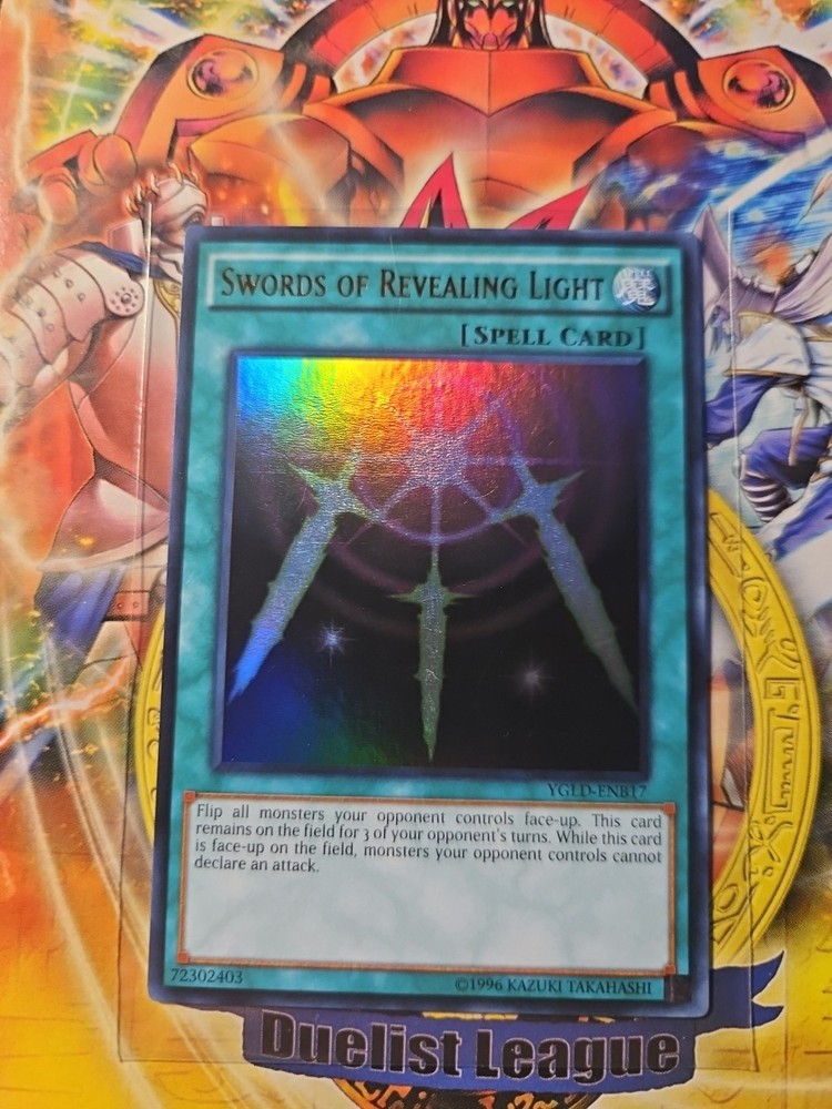 The product is a Yu-Gi-Oh! Trading Card Game card from the "King of Games: Yugi's Legendary Decks" set. It is an Ultra Rare card with the title "Swords of Revealing Light" and card number YGLD-ENB17. Manufactured by Konami, this Unlimited Edition card is a Spell card with a Normal spell type. It features the iconic Swords of Revealing Light effect, commonly seen in the Yu-Gi-Oh! anime and manga series. This English-language collectible card is a valuable addition to any Yu-Gi-Oh! card collection.