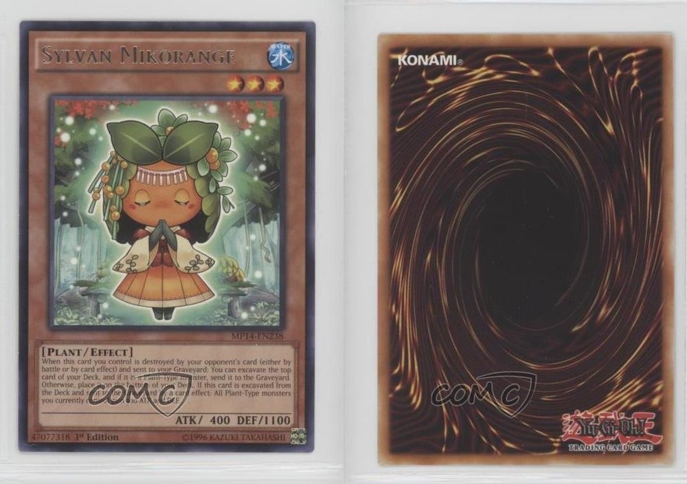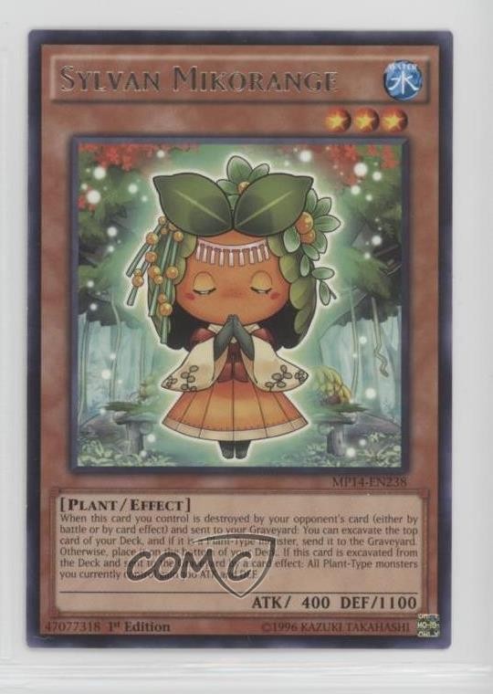 2014 Yu-Gi-Oh! Mega-Tins Mega Pack - [Base] - 1st Edition #MP14-EN238 Sylvan Mikorange COMC Item: 172308248 - YuGiOh Card Search for more: 2014 Yu-Gi-Oh! Mega-Tins Mega Pack Search for more: 2014 Yu-Gi-Oh! Mega-Tins Mega Pack - [Base] - 1st Edition View all of our Listings Auctions Buy It Now About Us Located in the beautiful Pacific Northwest, COMC (Check Out My Cards) is the world's largest consignment service for trading card singles. More than 10,000 people have used our consignment service to list over 50 million trading cards. Find out how we can help you consign your items on eBay by contacting us through eBay messaging. COMC -- "The Safe & Easy Way to Buy & Sell" Raw Condition for Modern Cards Unless otherwise noted, raw modern cards are listed in Near Mint-Mint condition or better. A NM-MT card appears to be Mint at first glance, but upon closer inspection, may exhibit some of the following: minor print defects (e.g. roller marks, print line, dimple), minor scratches, slight edge wear, and slight corner wear. Centering is clearly visible in the images provided and does not factor into our condition assessment. Raw Condition for Vintage Cards Unless otherwise noted, raw vintage cards are listed in Excellent condition or better. An EX card may exhibit some of the following: minor rounding of corners, surface wear, print defects, light scratches, and slight edge wear/chipping. Centering is clearly visible in the images provided and does not factor into our condition assessment. Domestic Shipping Combined shipping for multiple items is available. To receive combined shipping, please ensure all desired items are in your eBay shopping cart before proceeding to checkout. eBay limits orders to 40 items per order. We automatically combine multiple orders placed on the same day. If you place multiple orders on the same day, please contact us to request a refund of applicable shipping costs. Signature confirmation may be required on invoices over $400. All cards are protected and shipped securely. International Shipping COMC offers eBay's International Shipping (EIS) for international orders under $2,500* (see country exceptions below). All duties and import fees are paid at checkout; in the rare event that there are additional import fees upon delivery, these are borne by the buyer. EIS packages route through a shipping hub in Erlanger, KY before shipping to their final destination. Please note that EIS does not allow for combined shipments. The shipping rates are determined by eBay and cannot be adjusted. *Maximum sale price exceptions: Colombia, Kuwait ($2,000); Taiwan ($1,539); Chile, Costa Rica, Guatemala, Honduras, Trinidad and Tobago ($1,000); Antigua and Barbuda, Aruba, Belize, Dominica, Grenada, Philippines, Saint Kitts and Nevis, Saint Lucia, Montserrat, Turks and Caicos Islands ($500); Dominican Republic, El Salvador ($200). Please request a shipping quote through eBay messaging for orders that exceed the maximum sale price supported by eBay's International Shipping. You will be responsible for all duties and import fees for international orders shipped outside the EIS. All cards are protected and shipped securely. Payment COMC does not accept offers on our cards through our eBay storefront. COMC utilizes eBay’s managed payments system. If you are experiencing difficulties making a payment, please contact eBay for assistance. Return Policy Returns are only accepted on the rare occasion the item is not as described. If you are making a return, please initiate the return process through eBay so a mailing label can be provided for you. Prior to listing, our expert team carefully assessed this item to represent it accurately. Please review the description and high-definition images prior to purchasing to ensure this item meets your satisfaction. We welcome you to contact us if you have further questions about this item. Trust and Integrity COMC carefully assesses each item consigned to us to prevent fraudulent items from entering the marketplace. If you believe an item offered on COMC may be fraudulent, please contact us with details so we can investigate the issue. Items we determine are outside our supported items policy may be removed. Last Modified: 6/3/2025 5:10:33 AM PDT