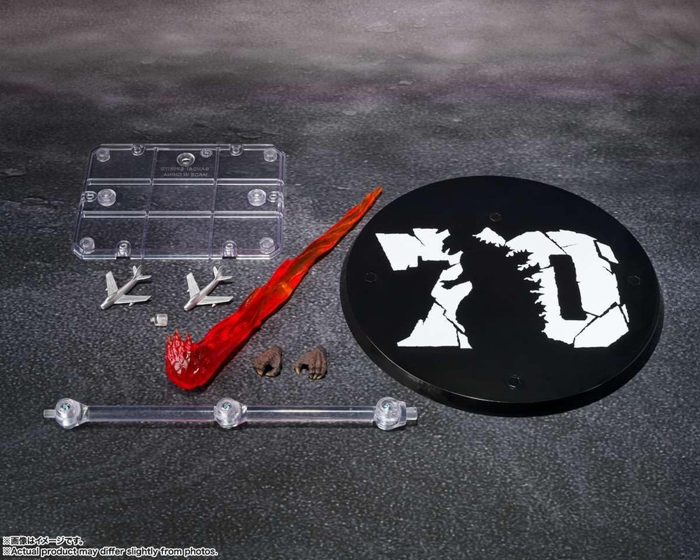 TAMASHII NATIONS - Godzilla - Godzilla [1954] 70th Anniversary Special ver., Bandai Spirits S.H.MonsterArts Action Figure Product Details Color: Godzilla (1954) 70th Anniversary Special Ver. Brand: TAMASHII NATIONS MPN: BAS66241 EAN: 4573102662415 UPC: Does not apply Product Dimensions: 7.2 x 4 x 5.9 inches Item Weight: 14.5 ounces Country of Origin: China Item model number: BAS66241 Manufacturer recommended age: 15 years and up Release date: February 28, 2025 Manufacturer: Bandai Spirits To commemorate the 70th anniversary of "Godzilla," "Godzilla (1954)" is now available in its original poster coloring as an S.H.MonsterArts! The figure has been sculpted and colored by Yuuji Sakai, the leading Godzilla sculptor. The figure is painted in the image of the movie posters of the time, and the intricate details recreate the impression of the suit from that time. By using the interchangeable left and right wrist parts, it is possible to hold the included airplane In addition, a radiation heat ray effect is included, so you can enjoy displaying it in the image of the poster. In addition, a "Godzilla 70th Anniversary Logo Pedestal" is included to commemorate the 70th anniversary of "Godzilla" [Set Contents] Main body, Interchangeable hand parts (L/R), Radiation heat ray effect parts, Airplane parts x 2, Stand To commemorate the 70th anniversary of "Godzilla," "Godzilla (1954)" is now available in its original poster coloring as an S.H.MonsterArts!The figure has been sculpted and colored by Yuuji Sakai, the leading Godzilla sculptor. The figure is painted in the image of the movie posters of the time, and the intricate details recreate the impression of the suit from that time. By using the interchangeable left and right wrist parts, it is possible to hold the included airplane. In addition, a radiation heat ray effect is included, so you can enjoy displaying it in the image of the poster. In addition, a "Godzilla 70th Anniversary Logo Pedestal" is included to commemorate the 70th anniversary of "Godzilla". [Set Contents] Main body, Interchangeable hand parts (L/R), Radiation heat ray effect parts, Airplane parts x 2, Stand[Set Contents]Main bodyInterchangeable hand parts (L/R)Radiation heat ray effect partsAirplane parts x 2Stand Look for origin of shipment: Only items shipped from within North America are being sold by authorized U.S. Retailers. The product box will have a Bandai Namco warning label, which is proof that you are purchasing an officially licensed Bandai Spirits product, distributed by its sole and authorized distributor (Bandai Namco) for the U.S. Markets. This product has been thoroughly tested for safety and meets all North American consumer product safety regulations. The affixed label also entitles the purchaser to product support assistance within the United States.