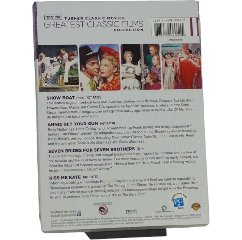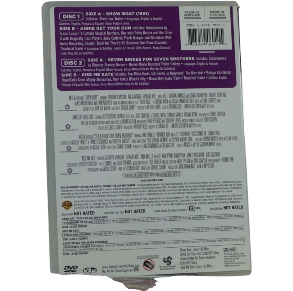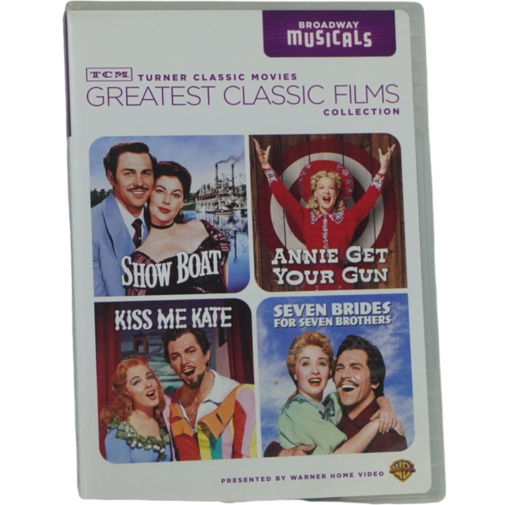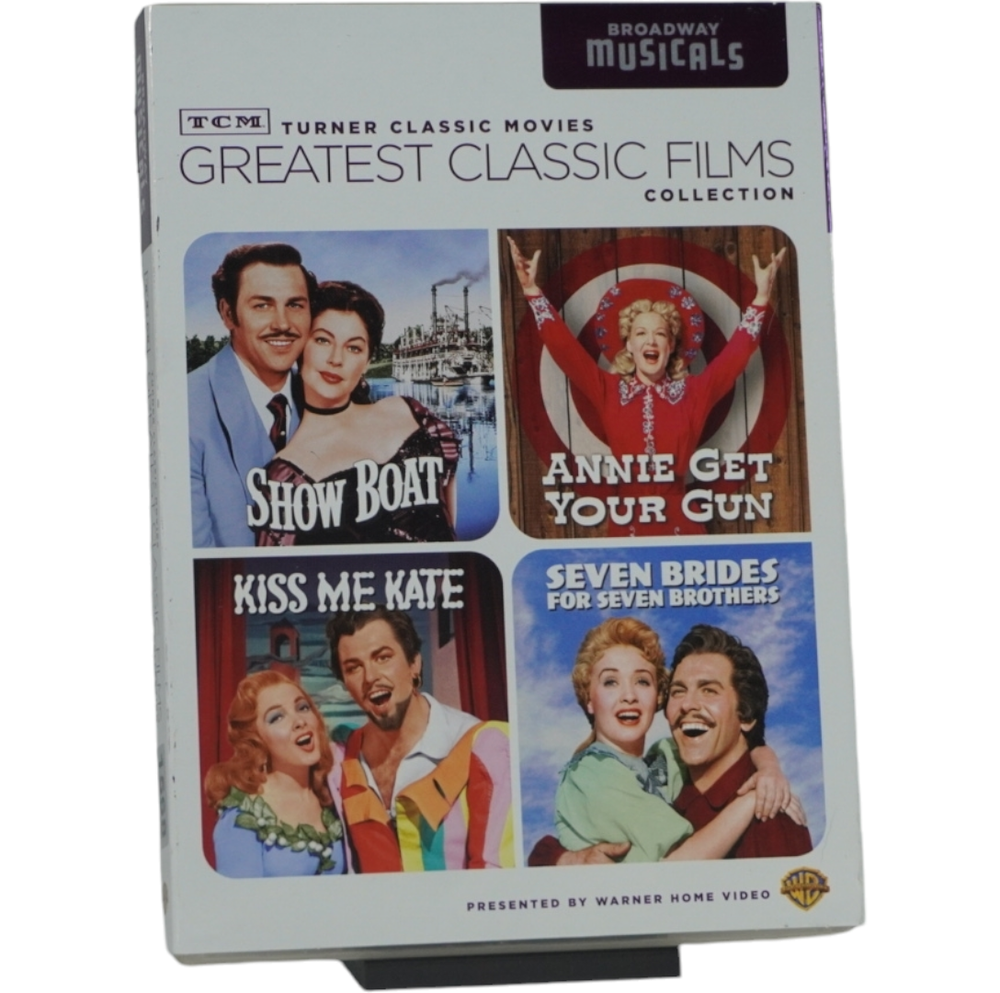 Unless otherwise stated DVDs, & Blu-rays are formatted for North American players (usually Region 1: North America NTSC format). Condition: Very good condition overall. No issues. Includes the following films Show Boat (1951) The 1951 film Show Boat is a vibrant Technicolor adaptation of the beloved Broadway musical by Jerome Kern and Oscar Hammerstein II. Set along the Mississippi River in the late 19th century, the story follows the lives of performers and workers on the Cotton Blossom showboat as they navigate love, loss, and the challenges of racial and social divides. The film stars Kathryn Grayson as Magnolia, the naive but talented daughter of the showboat’s captain, and Howard Keel as Gaylord Ravenal, a charming gambler who sweeps her off her feet. Ava Gardner delivers a powerful performance as Julie, a mixed-race singer facing prejudice and heartbreak. With unforgettable musical numbers like "Ol' Man River," "Make Believe," and "Can't Help Lovin' Dat Man," Show Boat is filled with gorgeous songs and rich storytelling. This 1951 version brings lavish production values, dazzling costumes, and timeless melodies to the screen, making it a must-watch for fans of classic musicals and anyone interested in a beautifully crafted slice of American theater history. Annie Get Your Gun (1950) Annie Get Your Gun is a 1950 musical film directed by George Sidney, based on the popular Broadway show of the same name. The story centers around Annie Oakley, a sharp-shooting, no-nonsense woman from Ohio, played by Betty Hutton. Annie is discovered by Frank Butler (Howard Keel), a handsome marksman, who becomes her romantic rival and love interest. The film follows their adventures as they both compete in a wild west-style shooting competition, with plenty of comedic rivalry and romantic tension. Set against the backdrop of a traveling circus, Annie Get Your Gun is filled with energetic performances, catchy songs like "There's No Business Like Show Business" and "Anything You Can Do," and lively choreography. The film explores themes of love, self-confidence, and the breaking of gender norms, as Annie proves herself to be a true star in a man's world. With its vibrant costumes, humor, and heartfelt moments, the film is a timeless example of classic Hollywood musicals. Seven Brides For Seven Brothers (1954) Seven Brides for Seven Brothers is a 1954 American musical film directed by Stanley Donen, set in the rugged, mountainous backdrop of 1850s Oregon. The story follows the wild and comedic adventures of a mountain man named Adam Pontipee (Howard Keel), who marries a young woman named Milly (Jane Powell) and brings her to live on his isolated farm. However, Adam’s six unruly, bachelor brothers, who live in the nearby woods, are less than thrilled about the idea of sharing their brother's new wife. The plot kicks into motion when Milly tries to bring some civilization to the home, teaching the brothers proper manners and how to attract wives. When the brothers fall for local women, they kidnap them in a hilarious and unconventional attempt to win their hearts, leading to a series of misadventures and conflicts. Seven Brides for Seven Brothers is celebrated for its energetic dance sequences, including the famous barn-raising number, "Bless Your Beautiful Hide," and the highly choreographed "Goin' Courtin'." The film's blend of romance, humor, and stunning musical numbers, along with its picturesque setting, made it one of the most beloved musicals of the 1950s. The film explores themes of love, family, and the chaos of romance in a lighthearted and charming way. Kiss me Kate (1953) Kiss Me, Kate is a vibrant 1953 musical film directed by George Sidney, based on the Broadway musical of the same name by Cole Porter. The film is a lively adaptation of Shakespeare's The Taming of the Shrew, set against the backdrop of a musical production in the 1950s. The story revolves around a feuding divorced couple, Fred Graham (Howard Keel) and Lilli Vanessi (Kathryn Grayson), who find themselves cast as Petruchio and Katharina in a Broadway adaptation of the classic play. As rehearsals unfold, their off-stage romantic tensions resurface, leading to comedic and chaotic moments. The film features a rich score with memorable songs like "Another Op'nin', Another Show," "So in Love," and "Brush Up Your Shakespeare," blending clever lyrics and dynamic choreography with a lively ensemble cast. Kiss Me, Kate is notable for its dazzling production numbers, including a stunning rendition of "Too Darn Hot," and the use of both the play within a play structure and the charm of classic Broadway. The film explores themes of love, rivalry, and the complexities of relationships, all while delivering a playful nod to Shakespearean themes. With its energetic performances and vibrant visuals, Kiss Me, Kate remains a beloved classic in the musical genre.