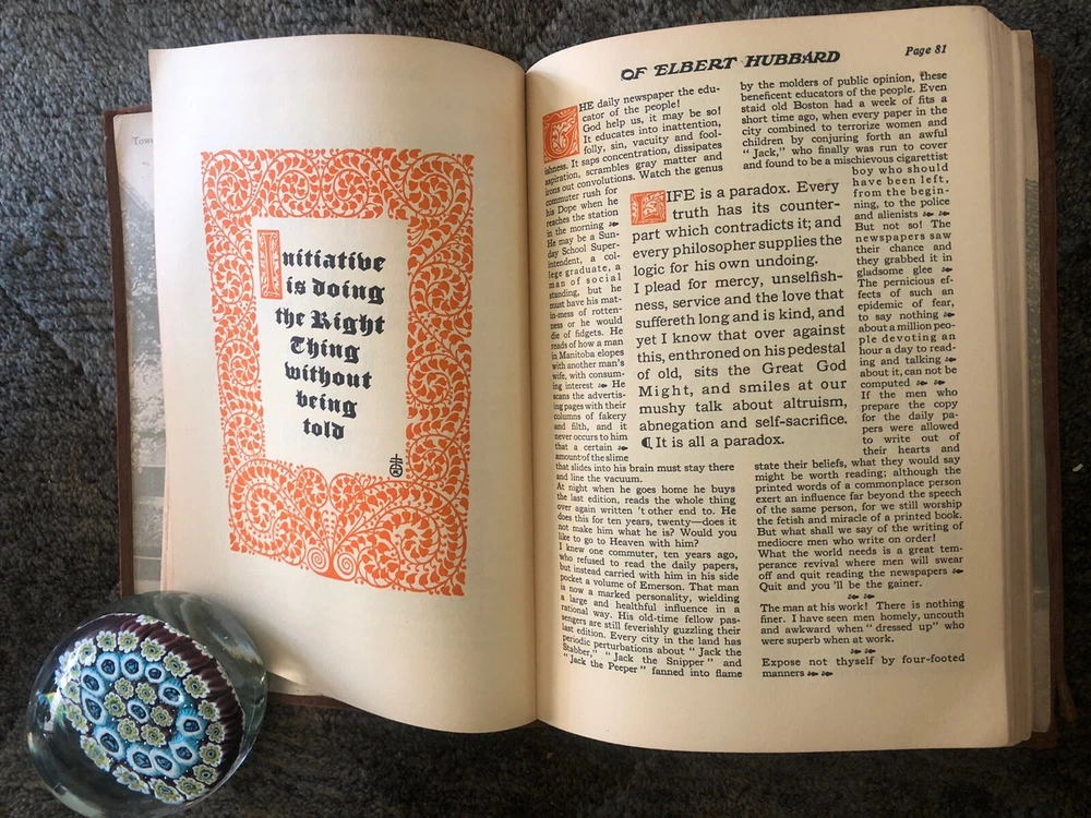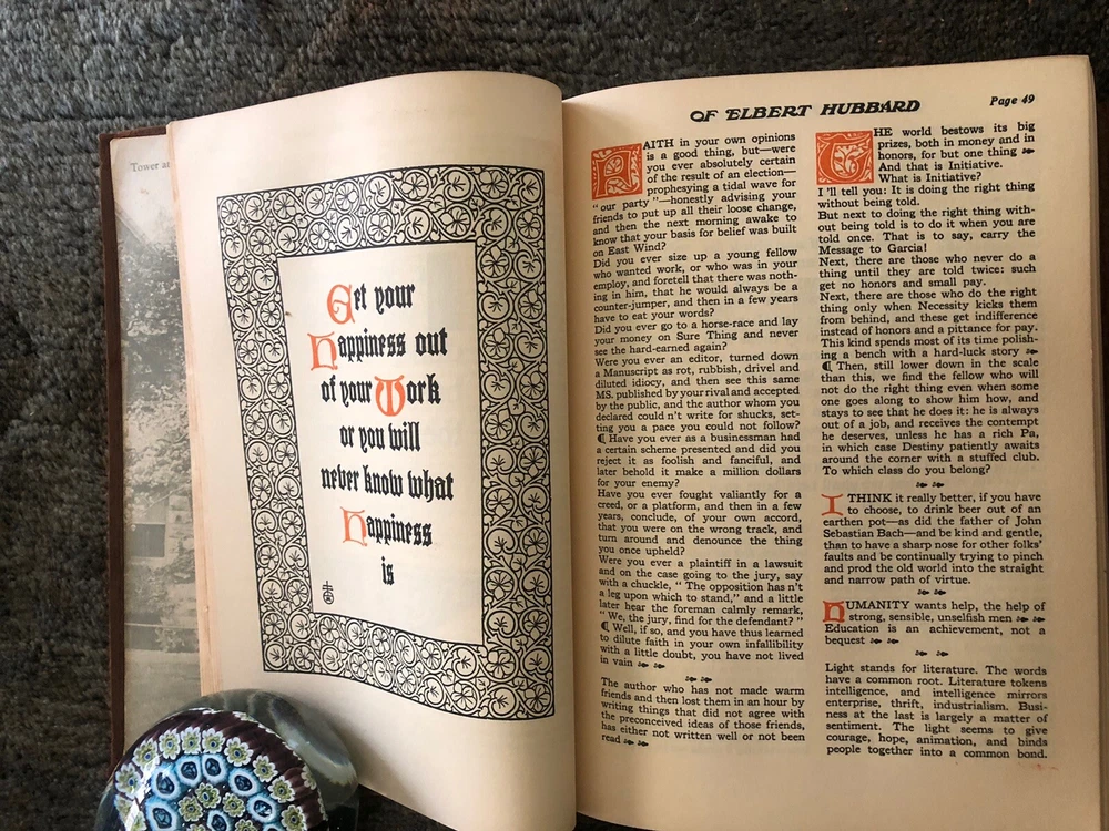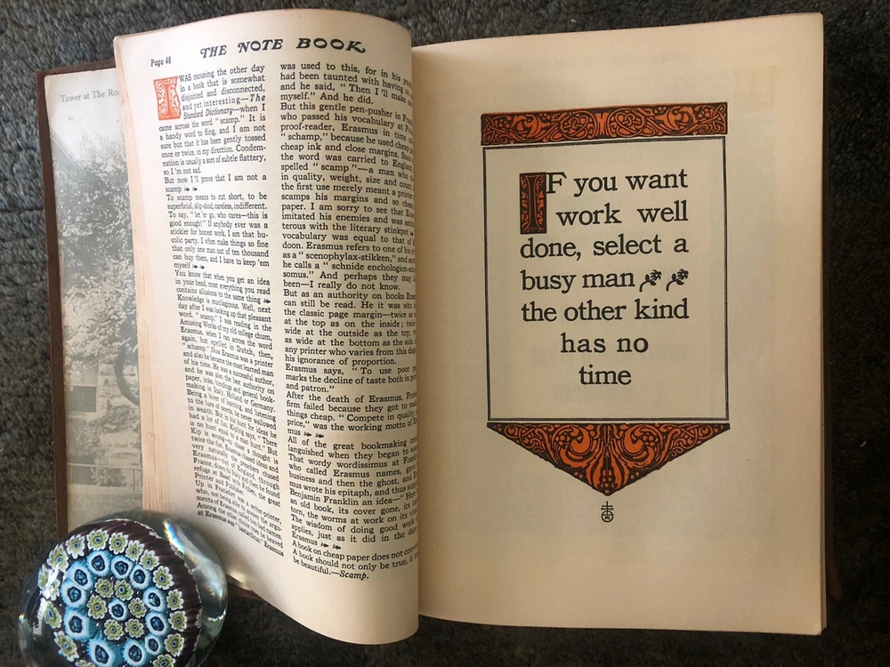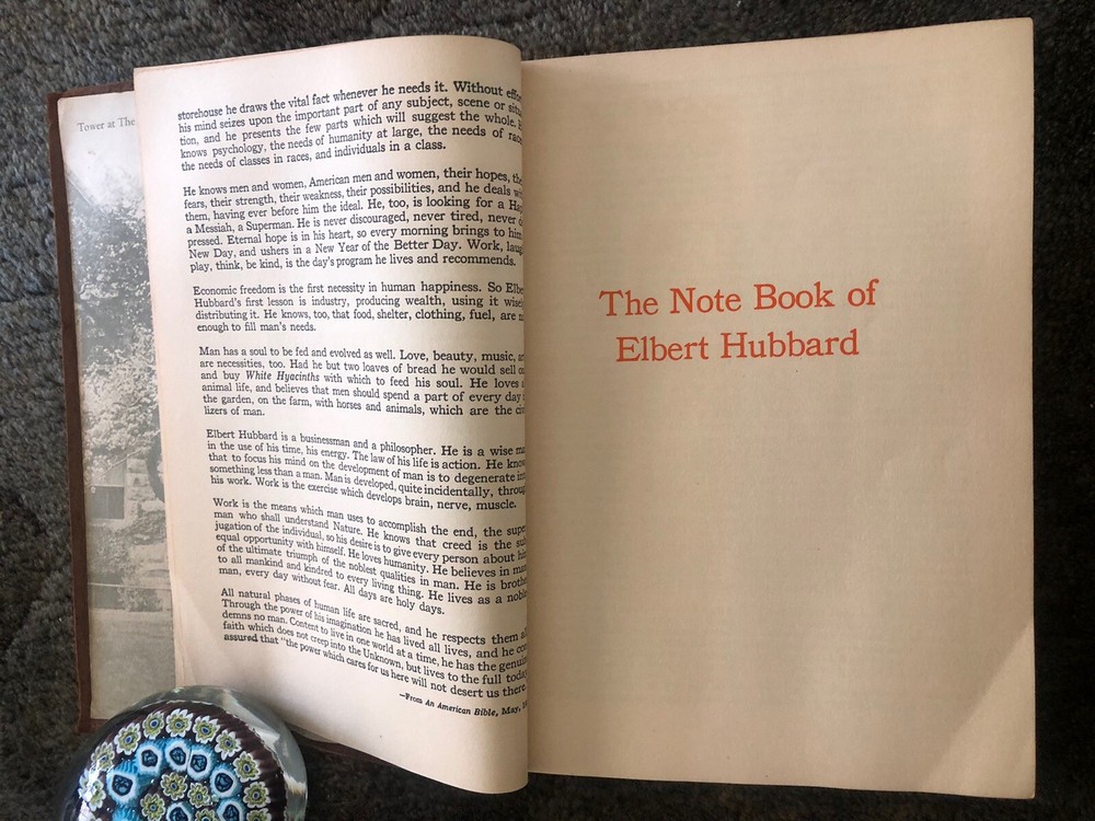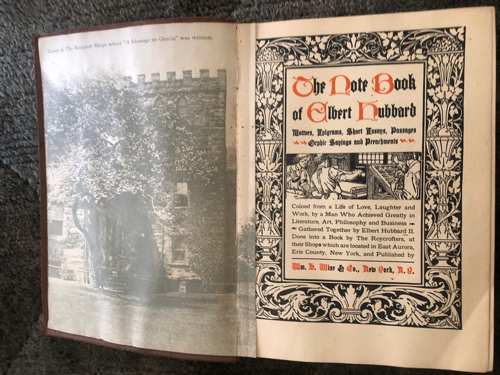 The Note Book of Gilbert Hubbard: Mottoes, Epigrams, Short Essays, Passages --Orphic Sayings and Preachments-- "Coined from a Life of Love, Laughter and Work, Man Who Achieved Greatly in Literature, Art, Philosophy and Business --- Gathered Together by Elbert Hubbard II. Done into a Book by the Roycrofters, at their Shops which are located in East. Aurora, Erie County, New Work, and published by Wm. Wise & Co., New York, NY LIMITED AVAILABILITY .... COLLECTIBLE!