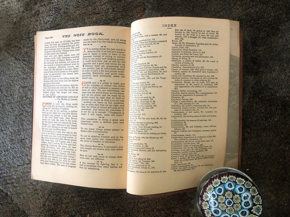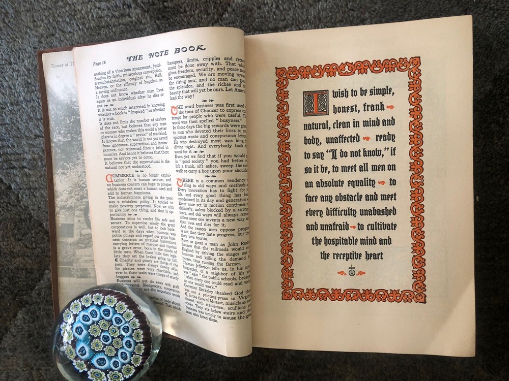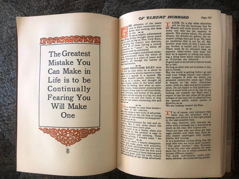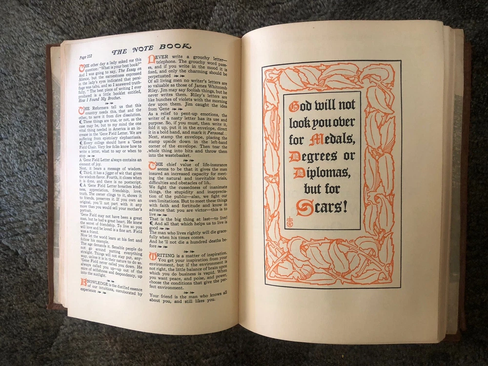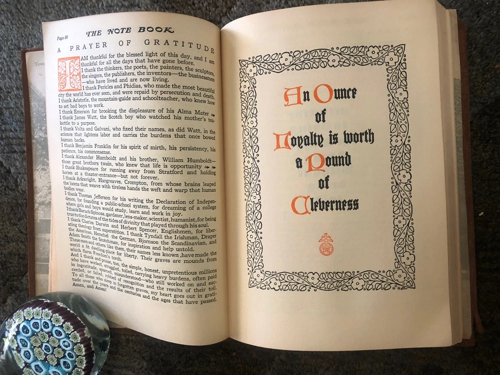 The Note Book of Gilbert Hubbard: Mottoes, Epigrams, Short Essays, Passages --Orphic Sayings and Preachments-- "Coined from a Life of Love, Laughter and Work, Man Who Achieved Greatly in Literature, Art, Philosophy and Business --- Gathered Together by Elbert Hubbard II. Done into a Book by the Roycrofters, at their Shops which are located in East. Aurora, Erie County, New Work, and published by Wm. Wise & Co., New York, NY LIMITED AVAILABILITY .... COLLECTIBLE!