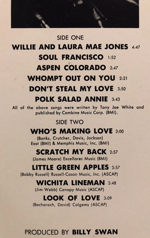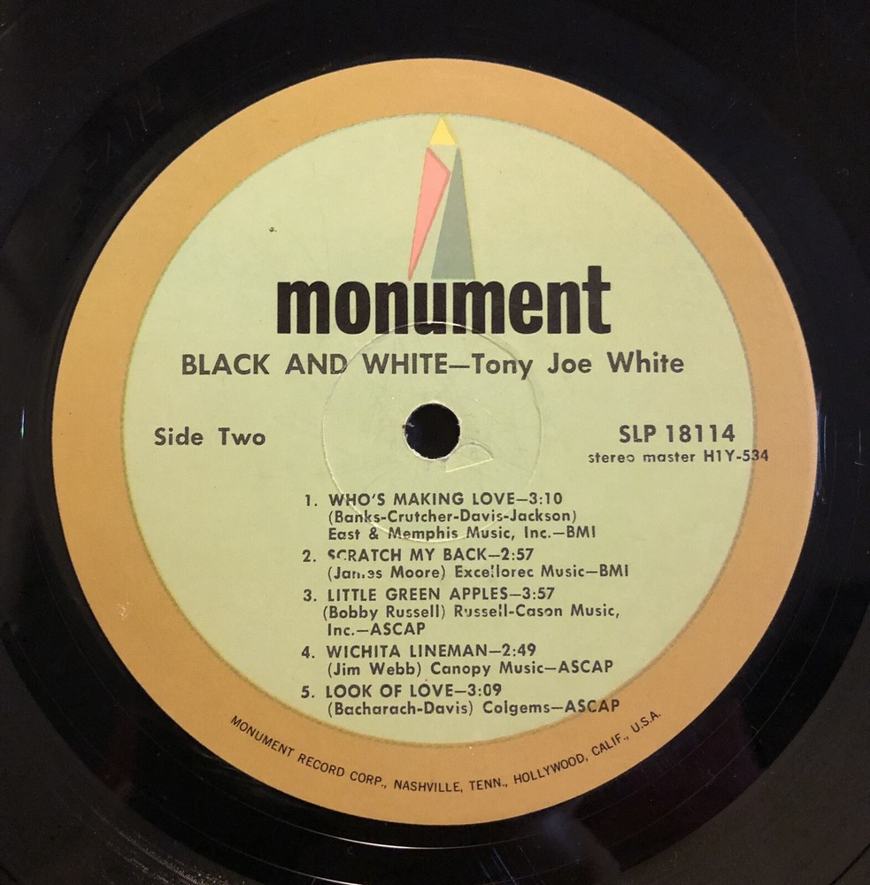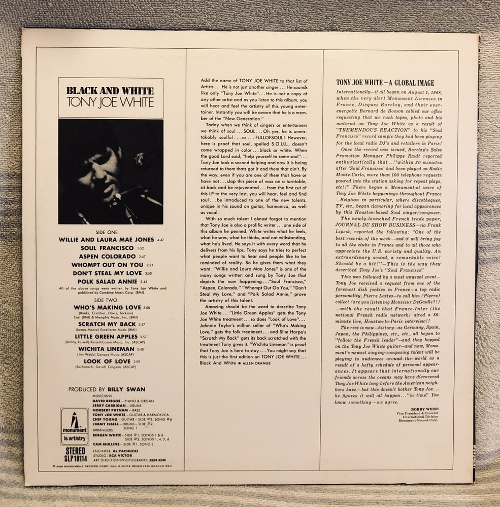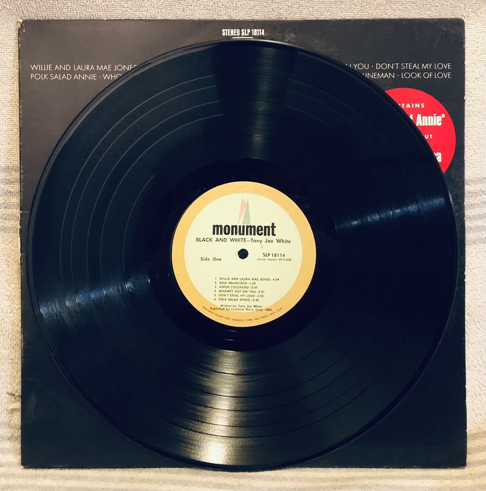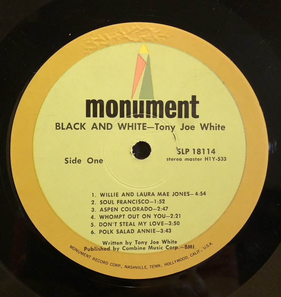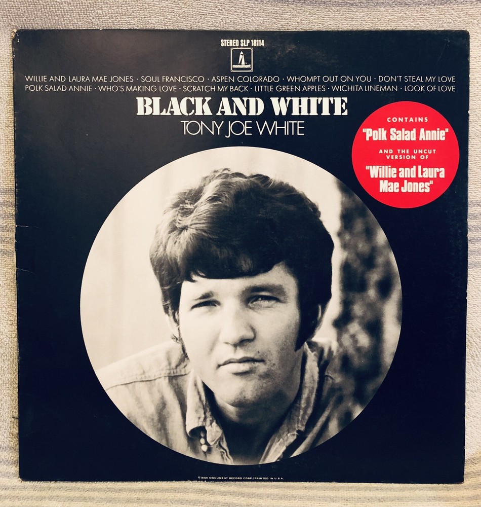 TONY JOE WHITE - BLACK AND WHITE - 1969 Monument Vinyl LP "POLK SALAD ANNIE" * Original 1969 Tony Joe White swamp rock LP "BLACK AND WHITE" on Monument Records SLP 18114. * Vinyl Grading: VERY GOOD PLUS (VG+) clean shiny with nice labels. * Cover Grading: VERY GOOD PLUS (VG+) straight clean solid no splits. * I believe this to be a FIRST PRESSING?