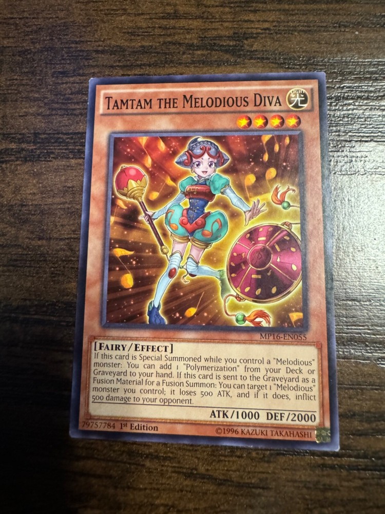 Elevate your Yu-Gi-Oh! TCG collection with Tamtam the Melodious Diva, a delightful addition from the 2016 Mega-Tins Mega Pack. As a 1st Edition card, this Fairy-type creature boasts an attack power of 1000 and a defense strength of 2000, making it a formidable yet enchanting contender in your duels. Card Number MP16-EN055, this Effect-type card is a must-have for players and collectors alike. With its Common / Short Print rarity, Tamtam the Melodious Diva is a gem for those looking to add depth and sparkle to their deck. Printed in English by Konami, this card's light attribute gives it a unique quality that stands out during gameplay. Whether for competitive play or as a treasured collectible, this card is sure to harmonize with your collection.