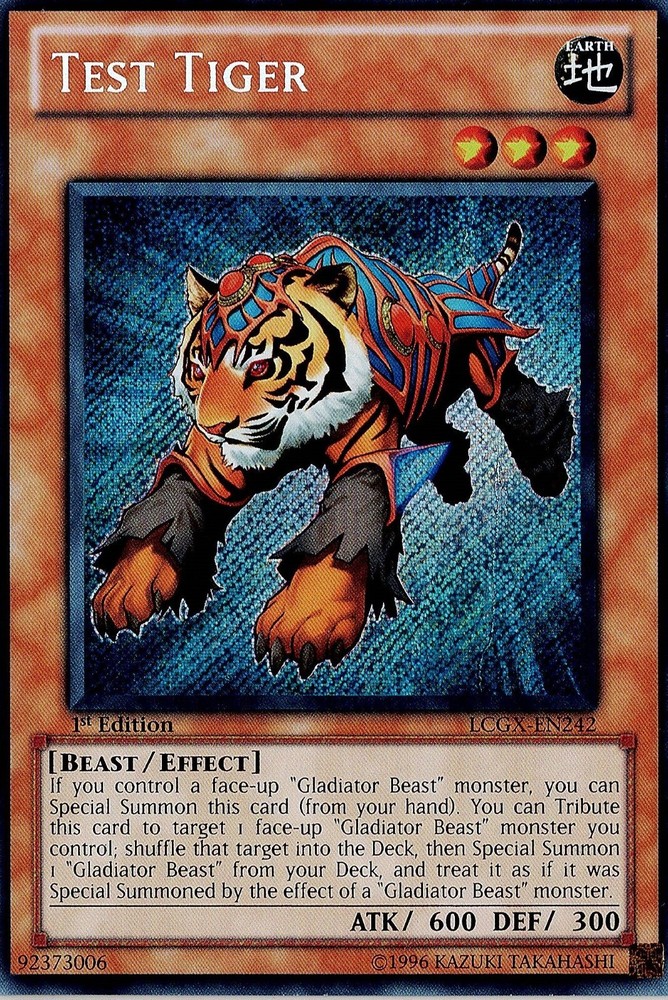 Test Tiger - Secret Rare - LCGX-EN242 - 1st Edition Card Description: If you control a "Gladiator Beast" monster, you can Special Summon this card. You can Tribute this card to return 1 "Gladiator Beast" you control to the Deck, and then Special Summon 1 "Gladiator Beast" from your Deck. The Special Summoned monster is treated as if it was Special Summoned by the effect of a "Gladiator Beast".