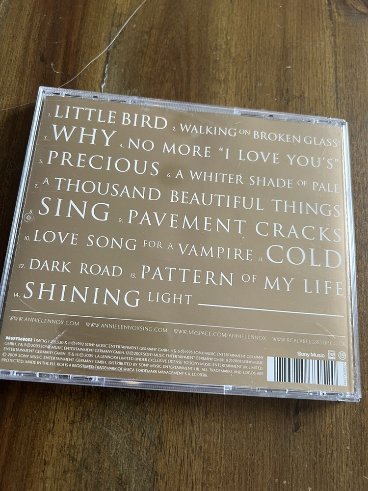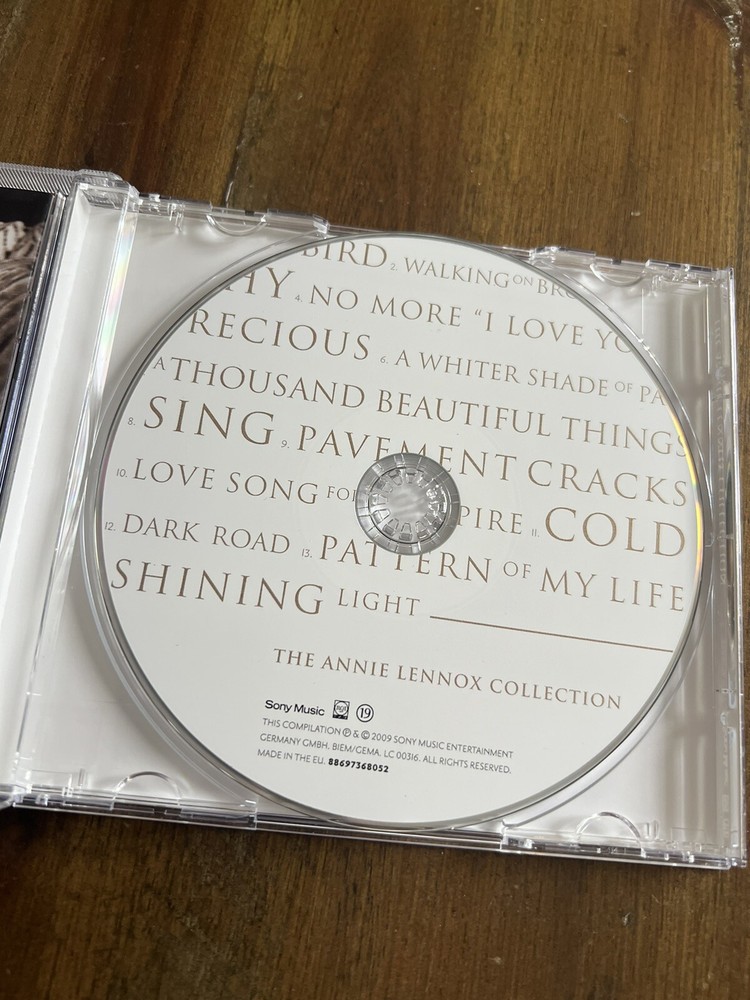 This CD features the amazing voice of Annie Lennox, with a collection of her greatest hits. The CD comes in a standard jewel case and has very good (VG) case and inlay conditions. It was released in 2003 by Sony and has a pop genre. The CD grading is very good (VG) and it is a great addition to any music collection. The album features singer-songwriter style with English language and voice instrument. This CD is a must-have for all occasions and is a great gift idea.