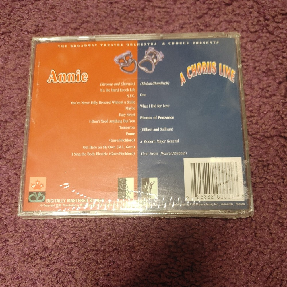 The Broadway Theatre & Chorus brings to you a sealed CD of the famous Broadway musicals - Annie and A Chorus Line. This 1996 release by CVD Manufacturing is a must-have for all the music enthusiasts out there. The album features the original soundtracks and musical scores of the two iconic productions, making it a valuable addition to any music collection. The CD contains tracks performed by The Broadway Theatre & Chorus and is of the CD format. The release title is A Chorus Line and the record label is CVD Manufacturing. The album falls under the categories of Music and CDs. So, grab your copy now and enjoy the classic Broadway musicals in high-quality audio.
