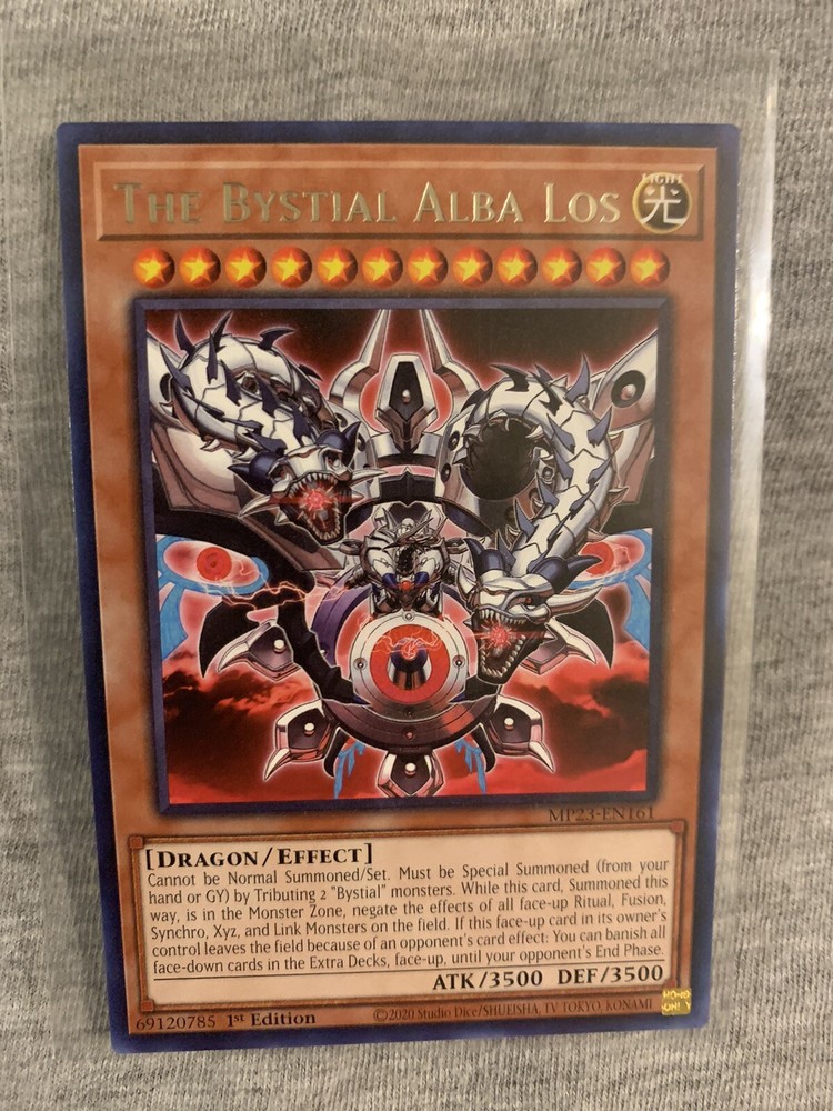 The Bystial Alba Los MP23-EN161 is a rare effect card from the 25th Anniversary Tin: Dueling Heroes Mega Pack set of the Yu-Gi-Oh! TCG game. It has a defense/toughness of 3500 and an attack/power of 3500. This 1st edition card is in English and manufactured by Konami. The card features a dragon creature/monster type and has a light attribute/MTG color.
