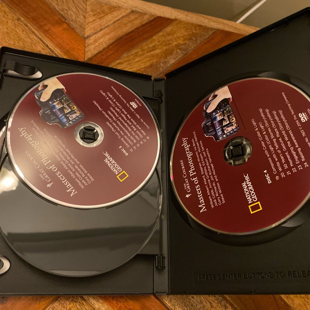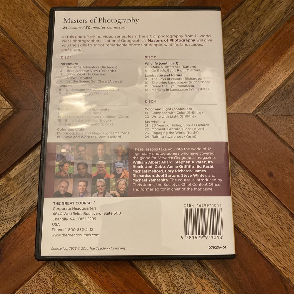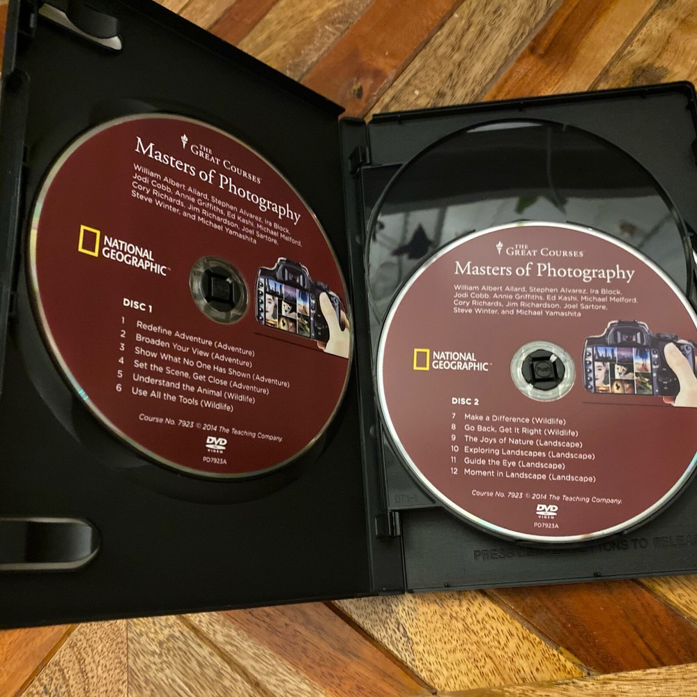 Great courses DVD set Masters of photography National Geographic Learn photography from 12 National Geographic Masters, including William Albert Allard, Steven Alvarez, Ira, Jodi Cobb, Annie Griffiths, ed Kashi, Michael Melford, Corey Richards, Jim Richardson, Joel, Sartori, Steve, Winter, and Michael Yamashita DVDs are in very good condition as is the case. If you are interested in purchasing this DVD set and the other DVD set, I have listed, please request an invoice so I can combine shipping for you .