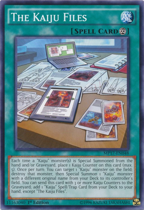 The Kaiju Files - MP17-EN048 - Common - 1st Edition Image is a stock photo of the card. You will receive the card in Moderately Played condition Condition: Moderately Played ATK/DEF : Attribute : Card Number : MP17-EN048 Card Rules : Card Text : Card Type : Continuous Spell Card Edition : 1st Level : Monster Type : Name : The Kaiju Files Passcode : Pendulum Scale : Rarity : Common Set : 2017 Mega-Tin Mega Pack Be sure to visit our store for a wide selection of your favorite cards! We are running specials RIGHT NOW!! Shipping Options: ~Ships in a regular white envelope with a stamp for FREE! (THERE IS NO TRACKING INFORMATION AVAILABLE FOR THE ABOVE METHOD. SHIPPING TIME IS 4-10 BUSINESS DAYS) ~Ships in a TRACKEDbubble mailer for $5.99! ~Shipments are handled same or next business day. ~FREE SHIPPING for each additional card, so shop around our store!