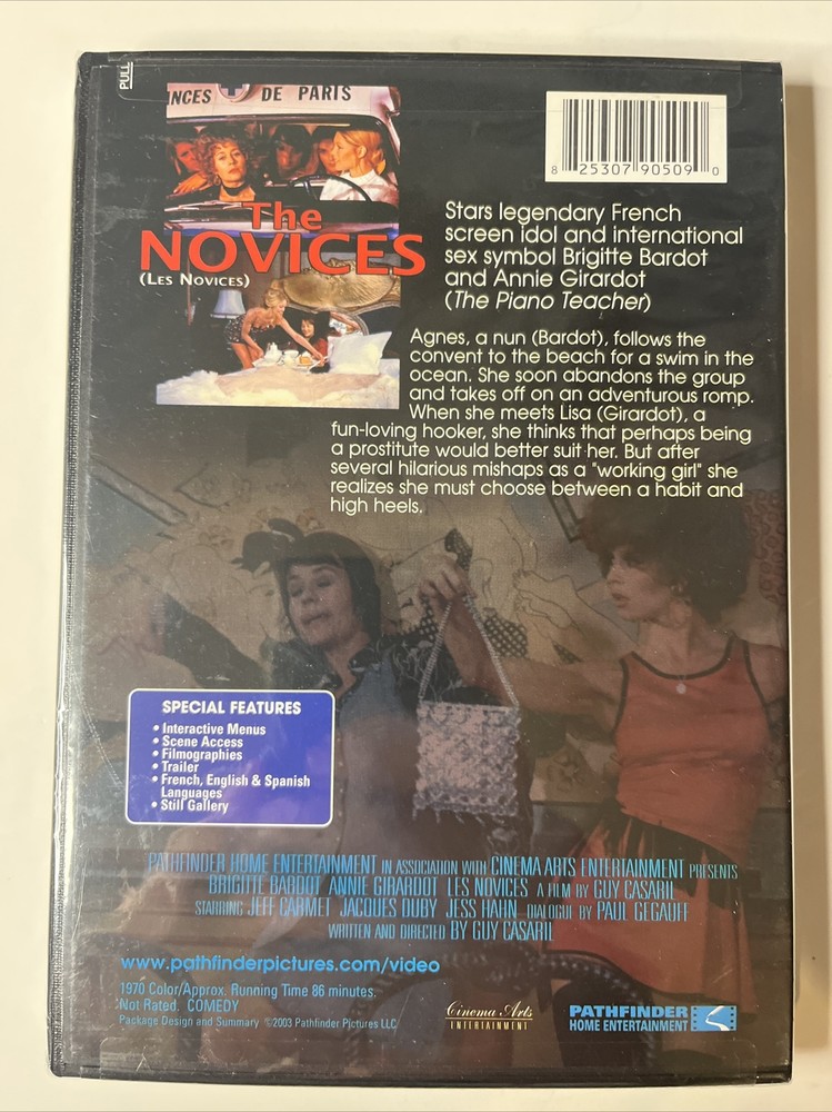 Brand new factory sealed A23/4.24 Enhance your foreign language movie collection with The Novices (DVD, 2003). This standard edition DVD features Brigitte Bardot and Annie Girardot in a French film directed by Guy Casaril and produced by Pathfinder. The movie is rated NR and has English, French, and Spanish language options, making it accessible to a wider audience. The Novices (DVD, 2003) belongs to the Foreign Language genre and has a region code of DVD: 1 (US, Canada...). The movie title is self-explanatory, making it an intriguing choice for those who appreciate foreign cinema. Let this film take you on a journey within the walls of a convent, where two actresses deliver impressive performances.