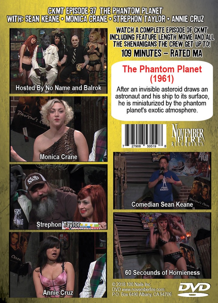 The Phantom Planet (1961) CKMT Creepy Koffee Movie Time season 3 episode 37 After an invisible asteroid draws an astronaut and his ship to its surface, he is miniaturized by the phantom planet's exotic atmosphere. Watch a complete episode of CKMT including feature length movie and all the shenanigans the Crew get up to! Hosted by Balrok the Demon and No Name! With: Comedian Sean Keane, Monica Crane, Strephon Taylor, Annie Cruz, & 60 Seconds of Hornieness. 109 minutes - Rated MA This title is provided on professionally produced and packaged DVD-R media. Due to the rarity and special-interest nature of this film, a commercially-pressed DVD would not be financially feasible.