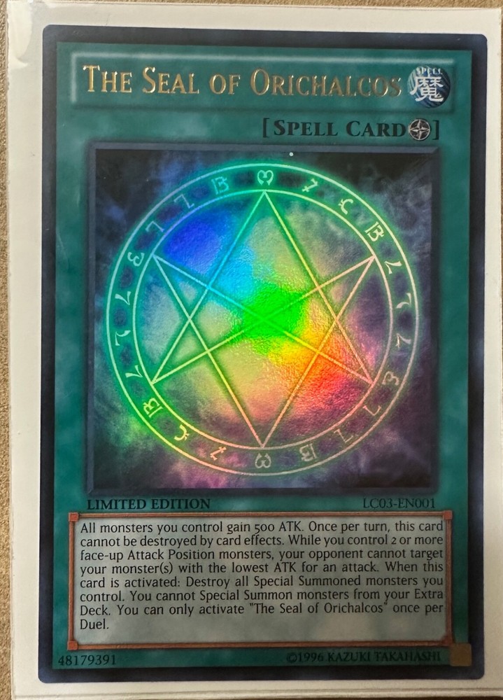 The Seal of Orichalcos LC03-EN001 is an ultra rare Yu-Gi-Oh card from the Yu-Gi-Oh Legendary Collection 3: Yugi's World-Limited Edition set. Manufactured by Konami, this English language card is a spell-normal with a unique attribute, making it a sought-after collectible for Yu-Gi-Oh! TCG fans. Limited edition in nature, this card holds value both as a gameplay piece and as a desirable collectible for card game enthusiasts.
