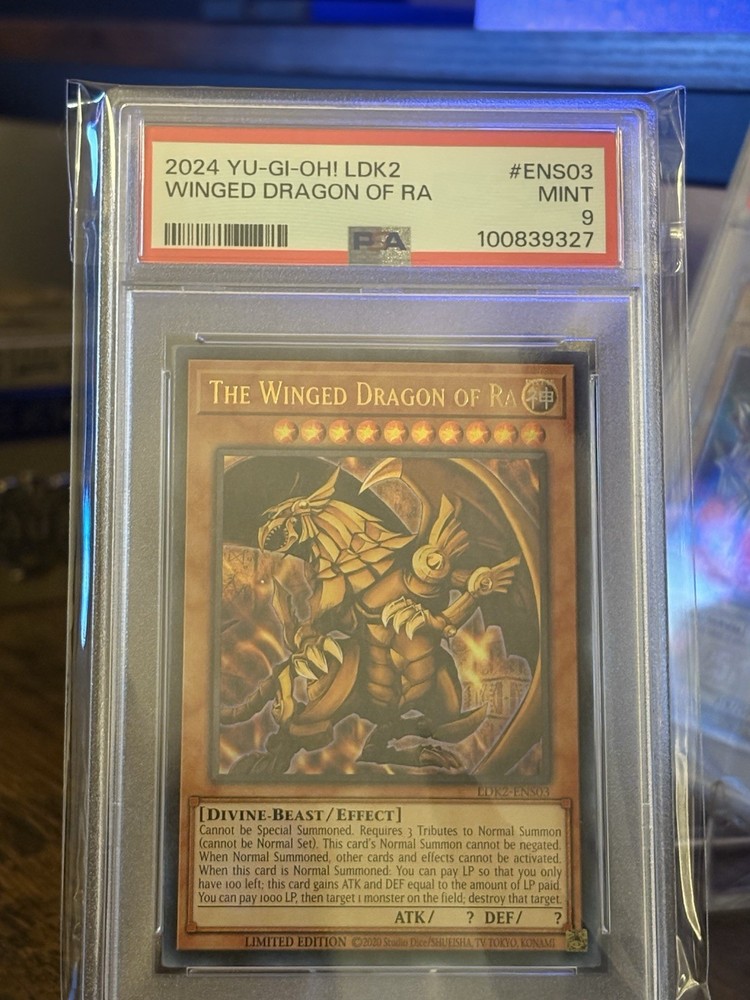 Unleash the power of ancient myth with "The Winged Dragon Of Ra" non-sport trading card, a limited edition collectible from Konami. This card, numbered LDK2-ENS03, has been professionally graded by the Professional Sports Authenticator (PSA) with an impressive score of 9, ensuring its high quality and authenticity. For fans of the storied Dragon franchise, this card is a must-have, encapsulating the might and mystique of The Winged Dragon Of Ra. It stands as a testament to the card's strength and desirability, making it a prized addition to any collection.