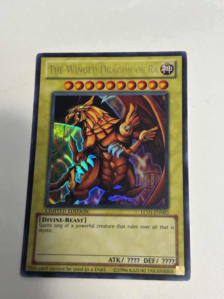 *Will Package Item securely* plastic sleeve inside hard plastic cover then wrapped in double sided hobby armor in a bubble wrapped envelope. The Winged Dragon of Ra is an Ultra Rare Limited Edition Normal card in the Yu-Gi-Oh! TCG, specifically from the Legendary Collection: 25th Anniversary Edition set. This Divine-Beast monster is a part of the Attribute/MTG:Color category of Divine, and its card number is LC01-EN003. Created by Konami, this English-language card features the powerful deity creature known for its unique abilities in the game.