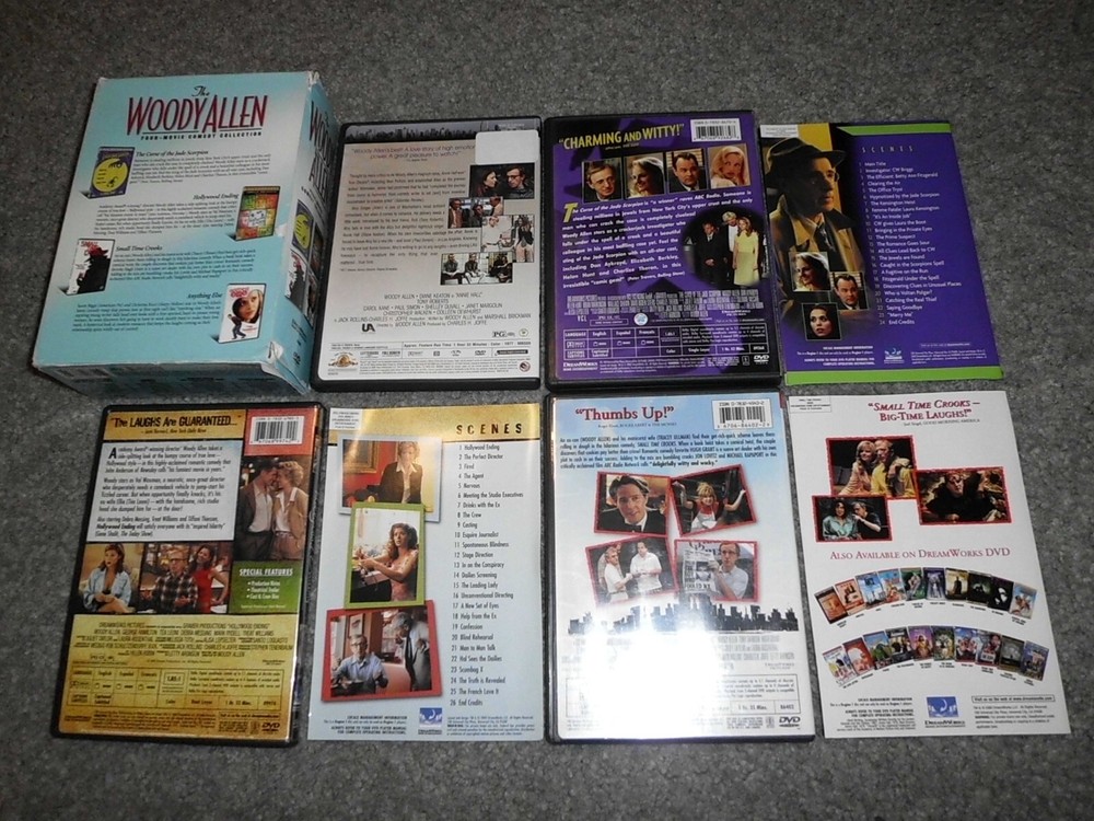 Up for auction is The Woody Allen Four-Movie Comedy Collection ( 1.85:1 Widescreen Aspect Ratio for all four films; 2004 DreamWorks 4-Disc DVD release ) on DVD! Please note that this is indeed the legitimate Region One U.S. DVD release (I never sell bootleg DVD sets of any kind! Anything you see listed by me is always 100% genuine and legit so please bid with confidence!) First of all, please note that Annie Hall is included INSTEAD of Anything Else . Annie Hall (disc + original case) is excellent to near mint , The Curse of the Jade Scorpion (disc + 4 page booklet + original case) is very good , Hollywood Ending (disc + Scenes insert + original case) is near mint , and Small Time Crooks (disc + 4 page booklet + original case) is excellent ! The original slipcover is in good condition with the most wear present (general scuffing). And, like with all of the DVD sets that I list on eBay, I have carefully and meticulously cleaned everything from top to bottom (although in this situation I merely touched up the sleeve cover), tested all four discs thoroughly, and I can assure you that all of them play perfectly! For additional details, I would encourage you to view all three of my pictures and bid with confidence as this is one fine set! My shipping rates are very reasonable to boot! Shipping will only be $4.50 for Media Mail ( with Tracking) within the United States. For international shipments, I will charge a calculated rate based on your location. Shipments to Canada usually amount to approximately $15-20, shipments to Europe run $20-25 , and shipments to South America, Asia, and Australia are normally $25-30 . Obviously, it depends on the weight and please note that I will consolidate shipping charges for both domestic and international shipments. For DVD's/Blu-rays in particular, I can ship a second item for free! For heavier items such as DVD box sets, however, it usually ends up being approximately $1-2 per additional item domestically and $3-4 internationally on average. Please message me if you have any questions regarding shipping charges...or anything else for that matter! Please note that I take great pride in shipping your winnings immediately after being paid as well! I encourage you to check out my other auctions/eBay store as I am always listing new movies, video games, disc golf merchandise, and other collectibles so please check back often! :)