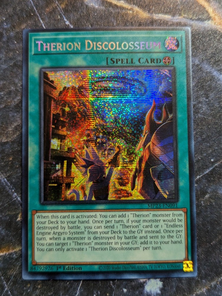 This rare and highly sought-after card, Therion Discolosseum, is a must-have for any serious Yu-Gi-Oh! TCG collector. With its stunning Prismatic Secret Rare rarity and 1st Edition status, this card is sure to be a showpiece in any collection. The card is part of the 25th Anniversary Tin: Dueling Heroes Mega Pack and features the Spell-Field card type. It is manufactured by Konami and is in English language. Don't miss out on the chance to add this incredible card to your collection.