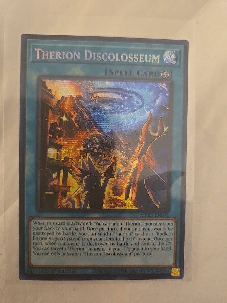 This rare and highly sought-after card is a must-have for any serious collector or fan of the Yu-Gi-Oh! TCG. With its stunning Prismatic Secret Rare design and heroic creature type, the Therion Discolosseum card is sure to impress. This English language card is part of the 25th Anniversary Tin: Dueling Heroes Mega Pack set, manufactured by Konami. It features the card number MP23-EN091 and is a 1st edition. Don't miss your chance to add this incredible card to your collection!
