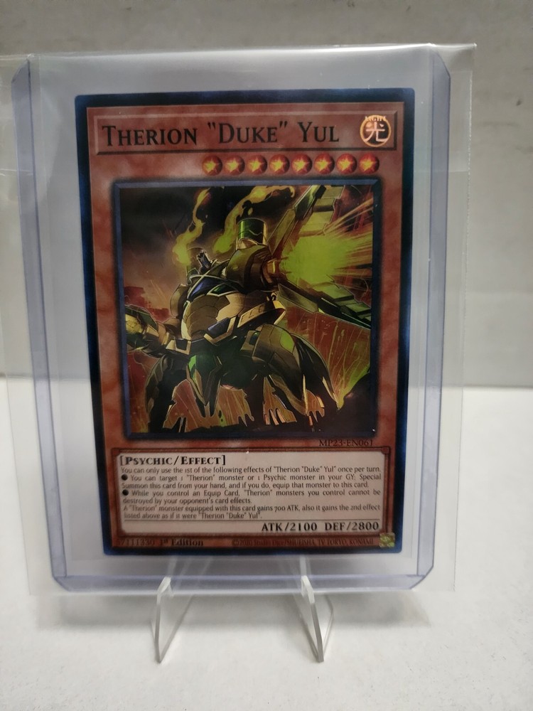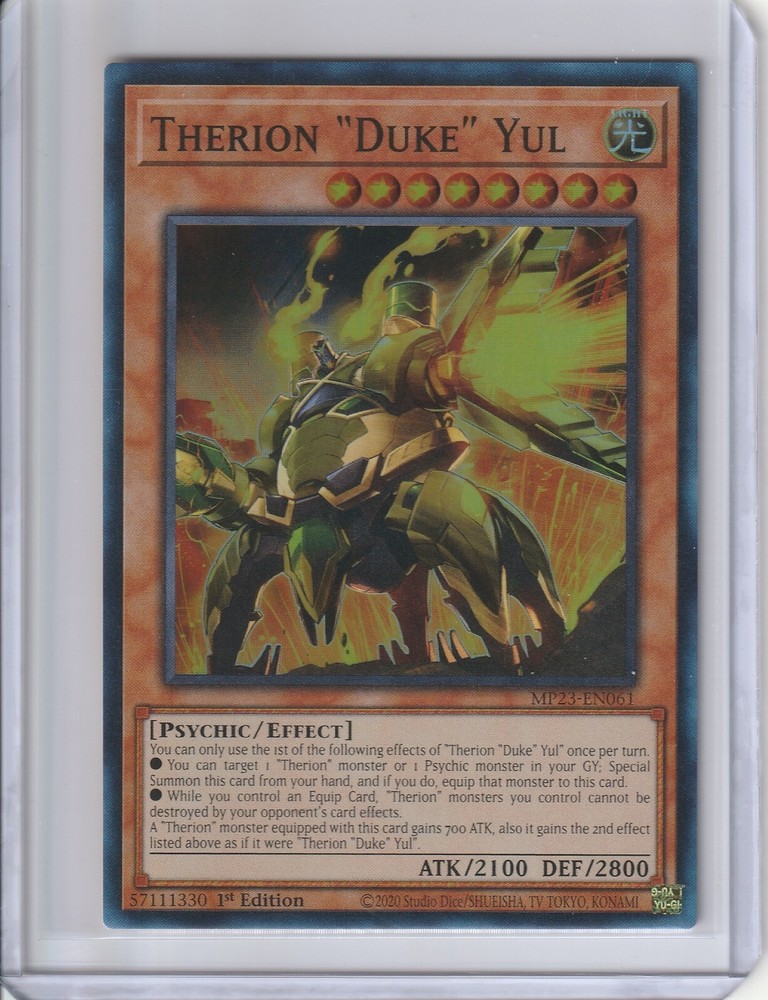 The product is a Yu-Gi-Oh! TCG card named "Therion 'Duke' Yul" from the 25th Anniversary Tin: Dueling Heroes Mega Pack set. It is a Super Rare card made of card stock in English, featuring a Psychic creature with 2100 Attack/Power and 2800 Defense/Toughness. The card is a 1st Edition with the card number MP23-EN061 and is manufactured by Konami in the United States. Suitable for ages 6 and up, this standard-sized card belongs to the Attribute/MTG:Color category of Light. Personal Collection in Penny Sleeves, along with top loader, any questions, feel free to ask.