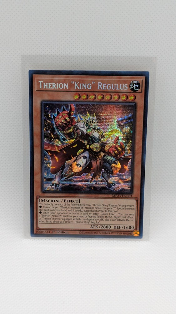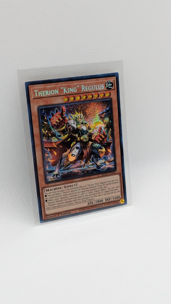 Same Day Shipping, Always Pack Fresh, Always Near Mint. The "Therion "King" Regulus" card is a Level 8 Earth attribute Machine type creature with 2800 Attack and 1600 Defense. It is from the 25th Anniversary Tin: Dueling Heroes Mega Pack set in the Yu-Gi-Oh! TCG. This Prismatic Secret Rare card has an effect where it can be Special Summoned by targeting a specific monster in the graveyard, and it can negate your opponent's card or effect activation. Additionally, when equipped to a "Therion" monster, it gains 700 ATK and can activate its effect as if it were "Therion \"King\" Regulus".