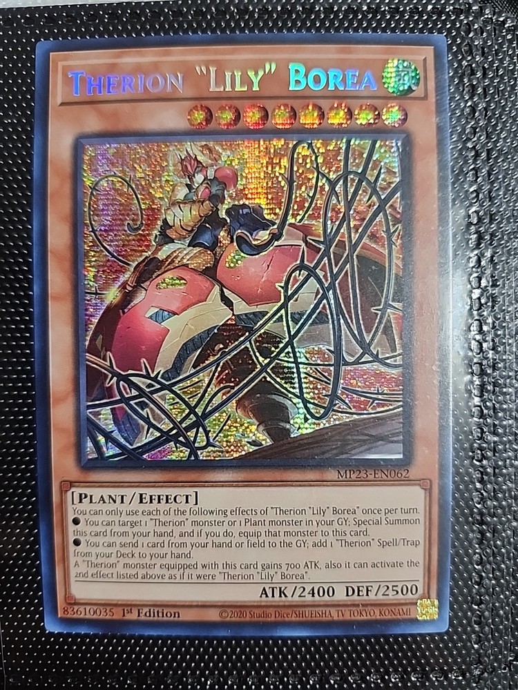 Elevate your Yu-Gi-Oh! TCG strategy with the Therion "Lily" Borea card from the 25th Anniversary Tin: Dueling Heroes Mega Pack. This card boasts an impressive 2400 attack power and 2500 defense toughness, making it a formidable addition to your deck. Its unique effects allow you to harness the power of "Therion" monsters and Plants in your graveyard to your advantage, giving you an edge in battle. The Prismatic Secret Rare Therion "Lily" Borea card, numbered MP23-EN062, is a must-have for collectors and players alike. The card is a 1st Edition Effect type monster with an English language print, manufactured by Konami. Its rarity and the strategic depth it brings to the game make it a valuable and intriguing choice for your next duel.
