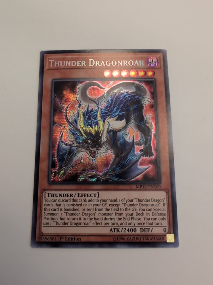 This Yu-Gi-Oh! TCG card, Thunder Dragonroar, is a prismatic secret rare card from the 2019 Gold Sarcophagus Tin Mega Pack. It is an effect card with an attack/power of 2400 and a defense/toughness of 0. The card is in English and was manufactured by Konami. The card number is MP19-EN169 and it is a 1st edition card. The card's attribute/MTG color is dark and it is a thunder creature/monster type.