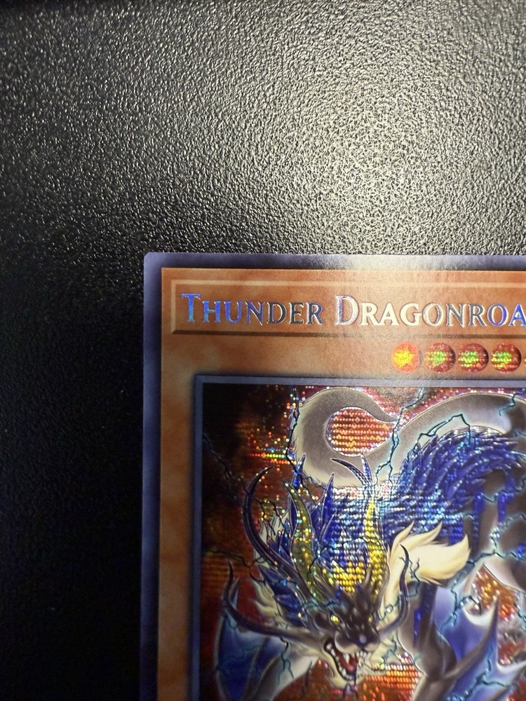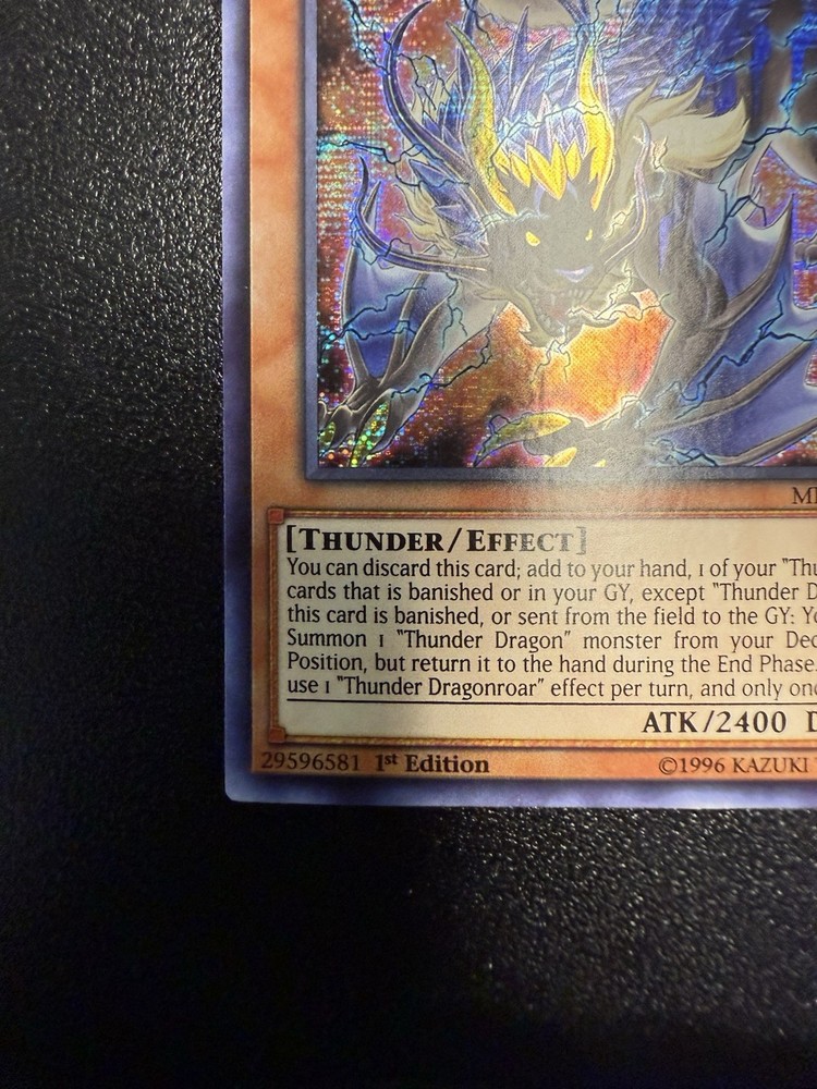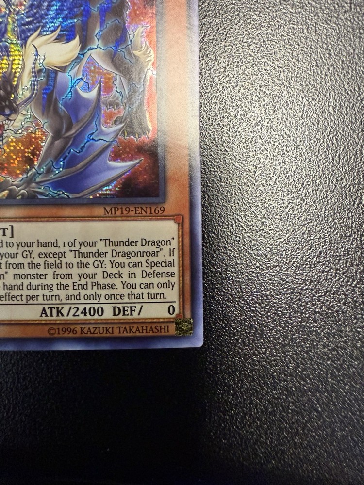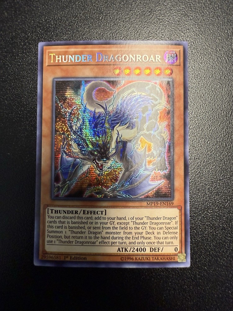 Nm-Mint Pulled and placed in sleeve and toploader Toploader and sleeve included The Thunder Dragonroar MP19-EN169 card from the 2019 Gold Sarcophagus Tin Mega Pack-1st Edition is a highly sought-after collectible in the Yu-Gi-Oh! Trading Card Game. This Prismatic Secret Rare card features a Dark attribute with a Thunder creature type, offering a powerful attack power of 2400. Manufactured by Konami, this English-language card is an Effect type with a unique design that collectors and players alike admire. Being a 1st Edition release, this card holds a special status in the trading card community, making it a valuable addition to any collection.