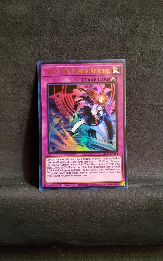 Time Thief Power Reserve is an Ultra Rare 1st Edition Trap-Continuous card from the Yu-Gi-Oh! TCG. Part of the 25th Anniversary Tin: Dueling Heroes Mega Pack, it features the Creature/Monster Type "Hero" and falls under the Attribute/MTG:Color "Trap." The card number is MP23-EN282 and is in English language. Created by Konami, it is a valuable addition to any card collection.