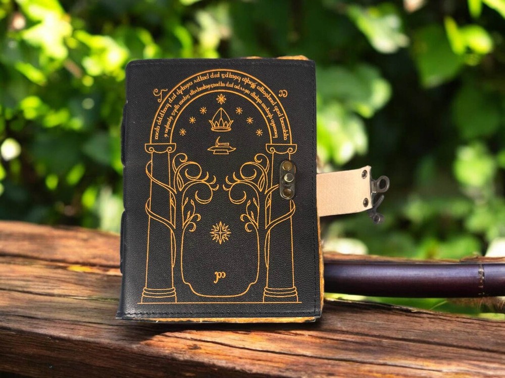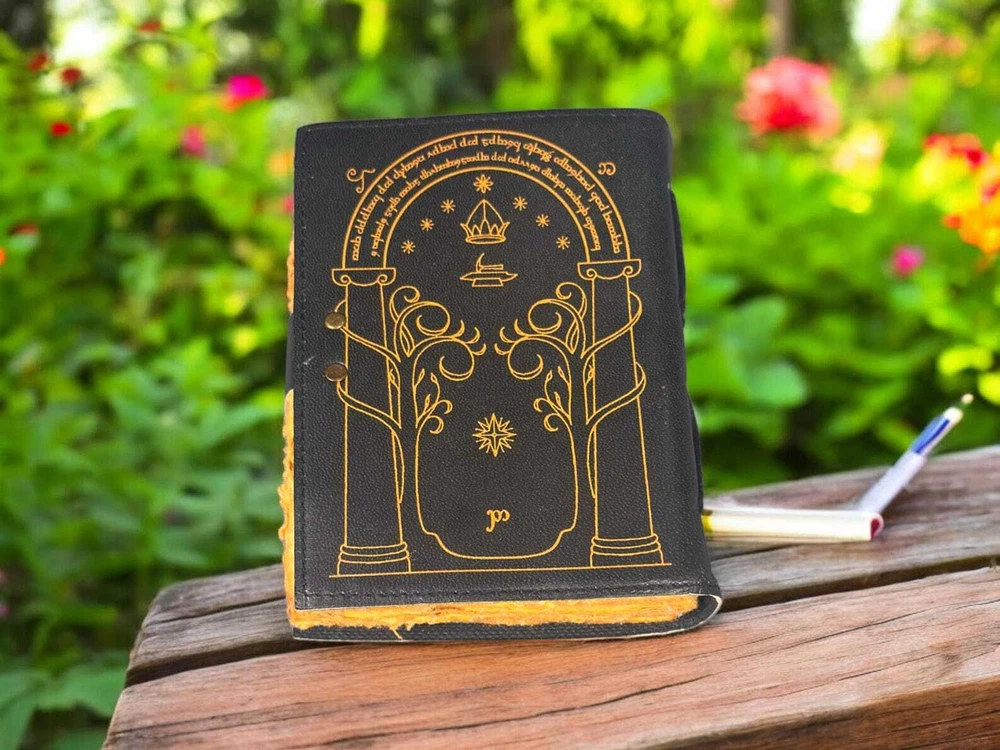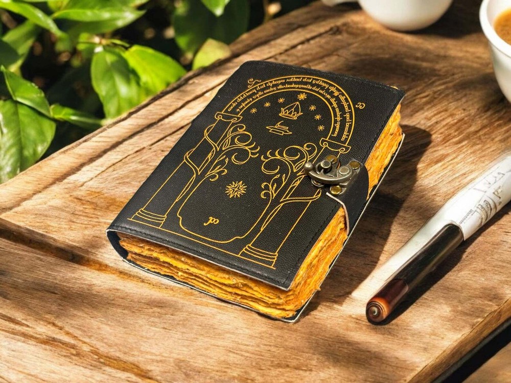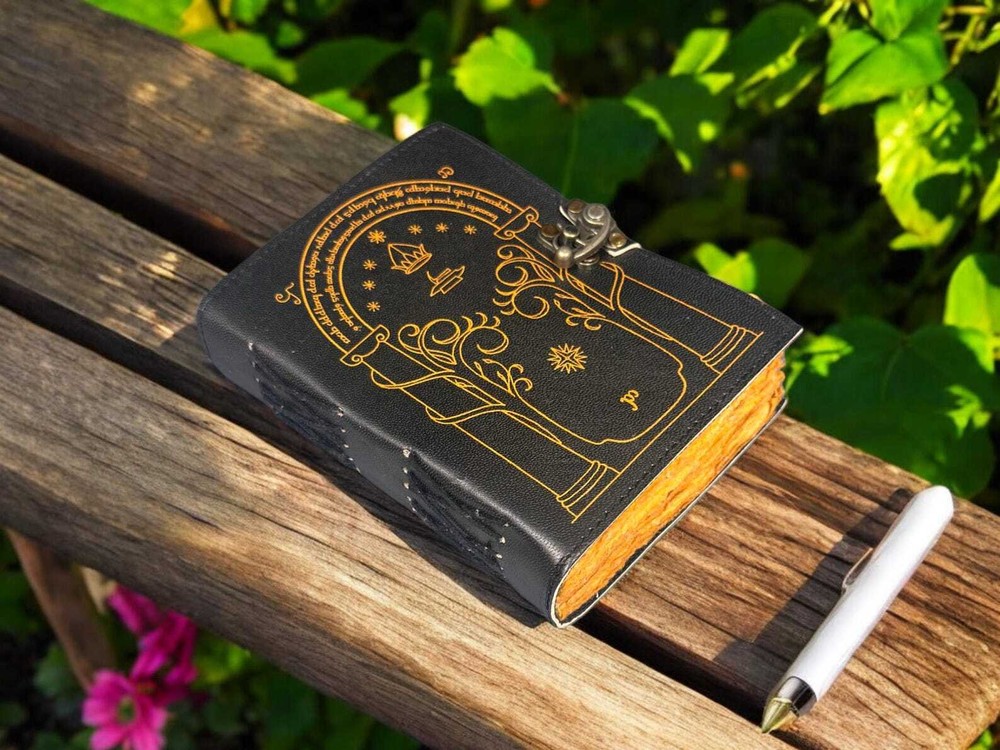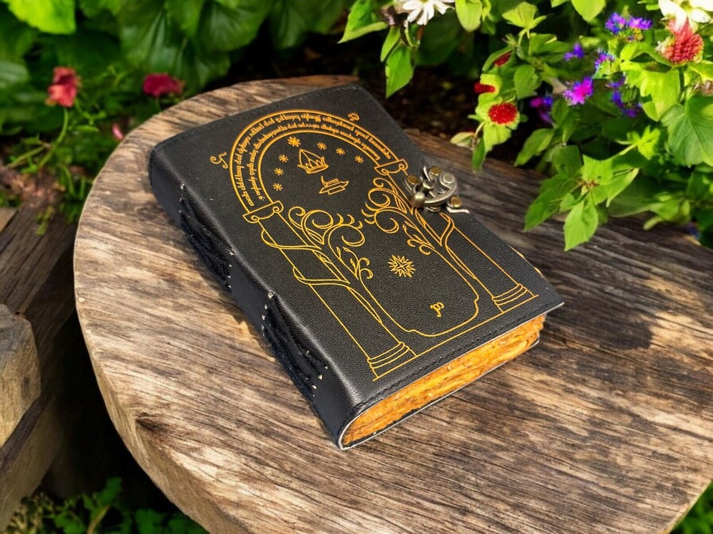 A Journal Is Like A Trusted Friend. You Can Use It To Solve Queries, Get Inventive, Or Record Valuable Memories For Them To Last Forever Or You Can Just Use It As A Gift For Your Wife, Son, Or A Daughter Or For Some Enthusiastic Writer In Your Family. • Print - Doors of Durin • Vintage lock closure • Genuine buffalo leather • Vintage deckle edge old paper • handmade rustic cotton paper Size : 7 X 5 Inches, 8 x 6 inches, 10 x 7Inches ●So the Doors of During are magical doors into a magical world. A fitting cover to a journal in which to explore your own thoughts ● The vintage clasp lock will keep all your valuable writing locked inside. ● Artist Sketchbooks, Photo Album, Traveling Notes, Business Executive, Logbook, Poetry Work, Journalists, Food Planner, Instagram Scrapbook and Bible Journaling ● The witchcraft supplies journal is printed with a special seven stone called “Chakra healing” which helps to reveal inner truth within yourself and encourage self-awareness and self expression. Leather notebook, leather journal, leather grimoire, book of shadows, gift for him, gift for her, gift for boyfriend, gift for girlfriend, gift for mother, wiccan, pagan, recipe notebook, travel notebook, wedding guest book.
