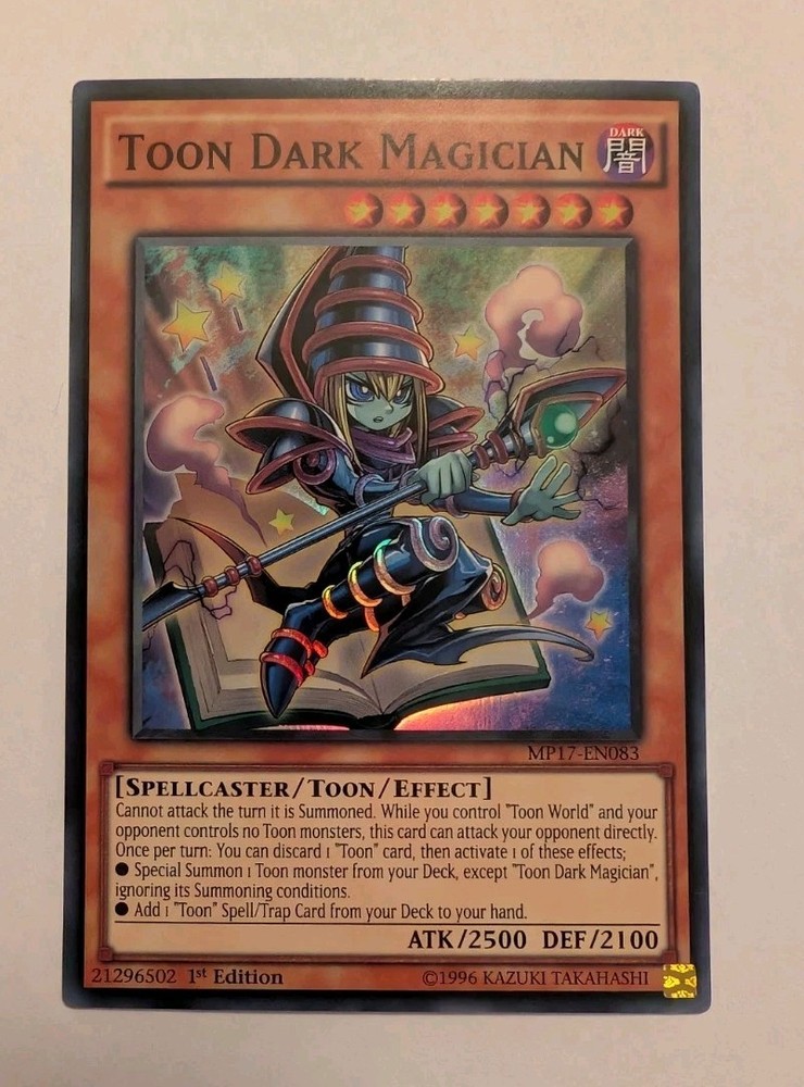 *please read before buying* Toon Dark Magician MP 17-EN083, from the 2017 mega-tins mega pack, 1st edition. This card is Near Mint. No visible marks, scratches, or dents. There is no edge wear or any other wear to my eye. See photos. Ships in a top loader and bubble mailer within one business day of payment. If you want to combine shipping or have any questions just let me know.
