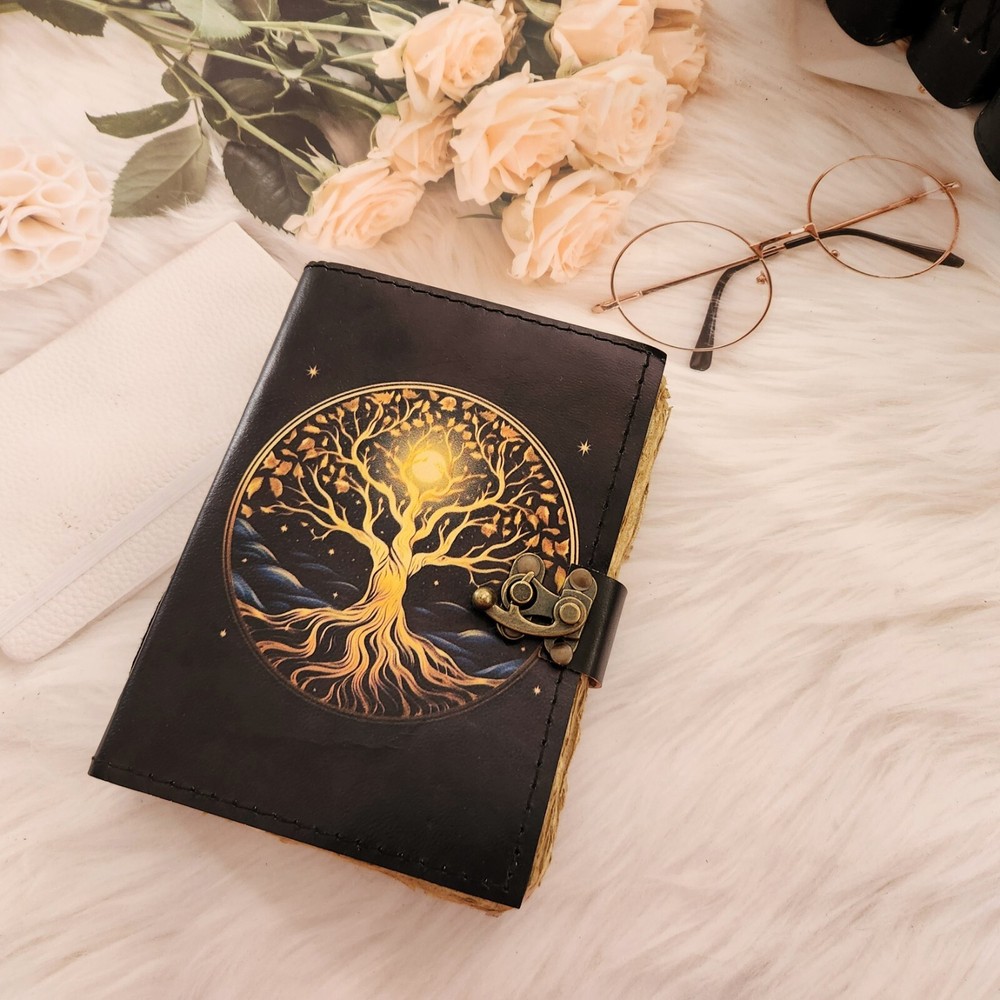 Tree & Moon Leather Journal – Handmade Leather Notebook with Lock Closure Features: ✔ Premium Leather Cover – Crafted from high-quality genuine leather with a rustic. ✔ Unique Tree & Moon Design – Embossed details add a mystical touch, making it a perfect keepsake. ✔ Deckle Edge Pages – 200 handcrafted, unlined pages with a natural deckle finish for a timeless feel. ✔ Secure Lock Closure – Keeps thoughts, sketches, and memories safe. ✔ Multipurpose Use – Ideal for writing, sketching, journaling, or gifting. Available Sizes: 📖 7x5 inches – Perfect for travel and everyday journaling. 📖 10x7 inches – A balanced size for creative writing or sketching. 📖 13x10 inches – Large and spacious for artwork, journaling, or guest book use. 🎁 Great for: Writers, artists, and dreamers Weddings, birthdays, and anniversaries Personalized gifts for loved ones Customization Available! Add initials or a special message for a unique touch. 📦 Fast & Secure Shipping – Delivered with care. ✨ Handmade with Love – Each journal is one of a kind.