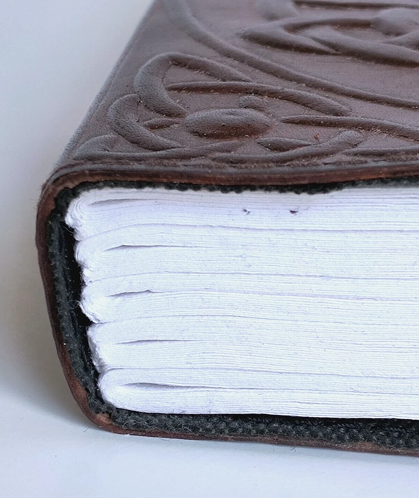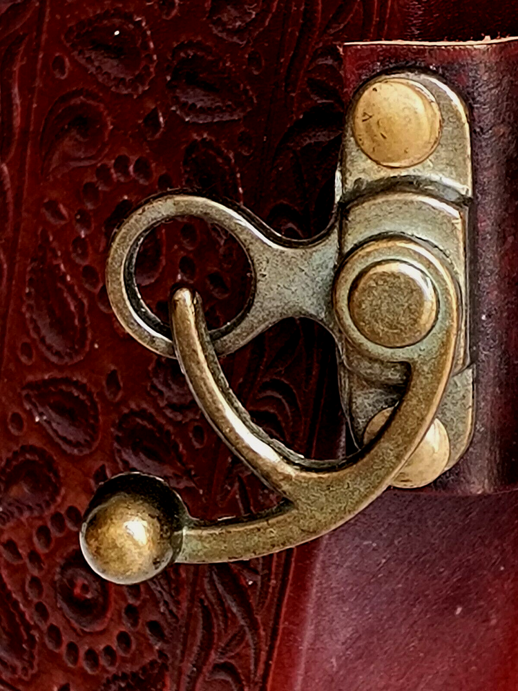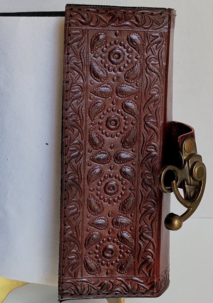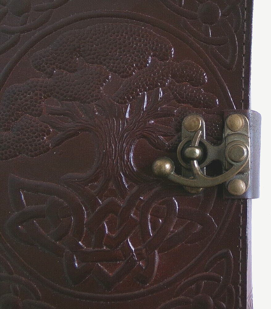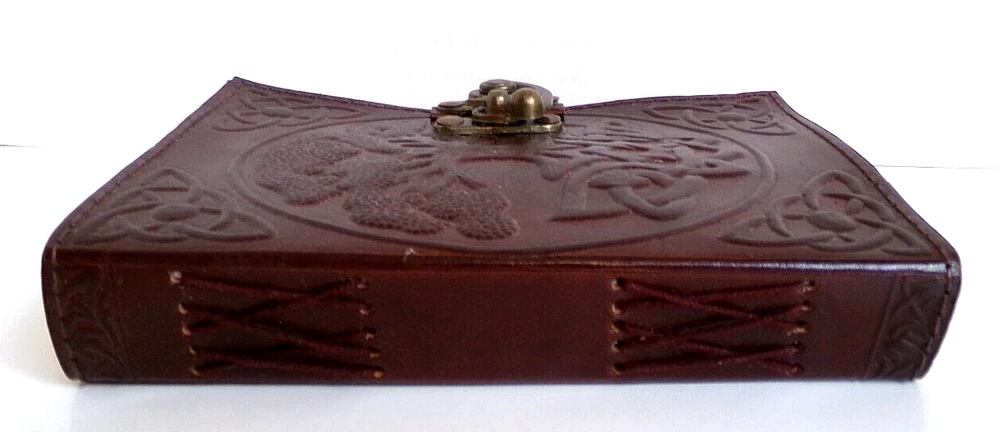 This is a Tree of Life embossed vintage leather bound journal, handmade in India. It features a collector's edition design, with no signatures or personalization.Height 7" x Width 5" x Length 1 1/4". Weight 11.4 oz. The clasp is made of brass and locks shut by sliding it across. The journal contains blank pages, suitable as a diary or notebook. Thank you for looking.