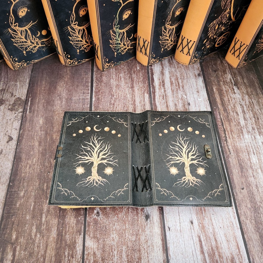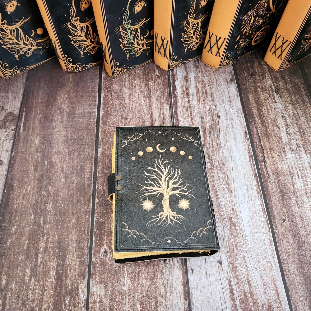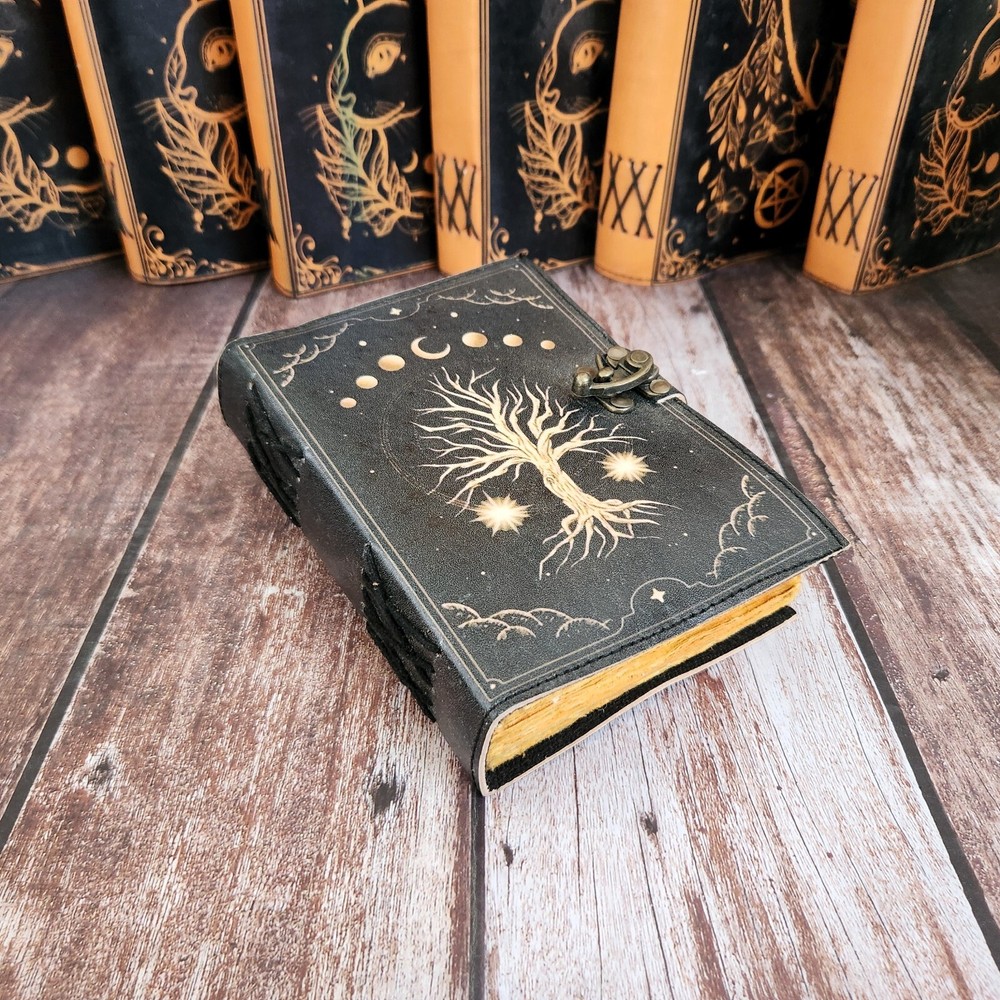 Tree of Life & Moon Leather Journal, Notebook, sketchbook, Leather Dairy, Travel Journal, Dream Journal, Wedding Gift, Personalized Gift. 1. Introducing our exquisite Tree of Life & Moon Leather Journal, a perfect companion for all your writing and creative endeavors. Crafted with utmost precision, this black leather journal features a stunning Tree of Life design that symbolizes growth, strength, and interconnectedness. 2. This versatile journal serves multiple purposes, making it an ideal choice for various needs. Whether you want to jot down your thoughts, sketch your artistic ideas, maintain a personal diary, or even record your dreams, this journal has got you covered. 3. With its 200 deckle-edged pages, you'll have ample space to pour your heart out onto the smooth, high-quality paper. The brass lock adds an elegant touch, ensuring the privacy and security of your precious writings. 4. This Tree of Life & Moon Leather Journal is not only a treat for yourself but also makes for a thoughtful and personalized gift. Whether it's for a wedding, anniversary, or any special occasion, this journal is bound to impress and leave a lasting impression. 5. Embrace the beauty of nature and indulge in the art of writing with our Tree of Life & Moon Leather Journal. Its timeless design, premium craftsmanship, and versatility make it a must-have for anyone seeking a stylish and functional journal.