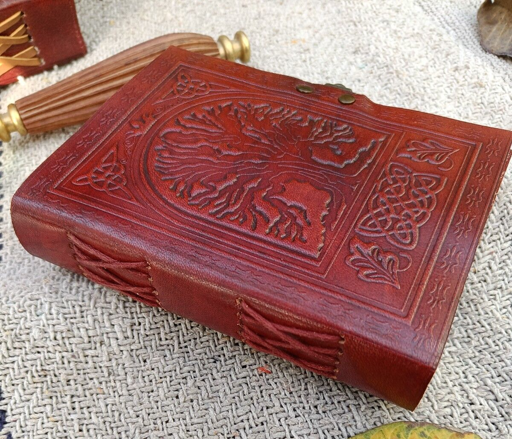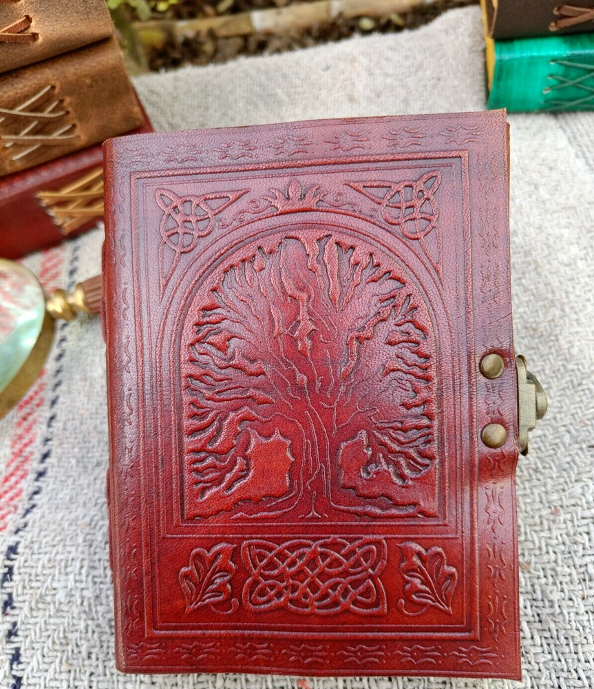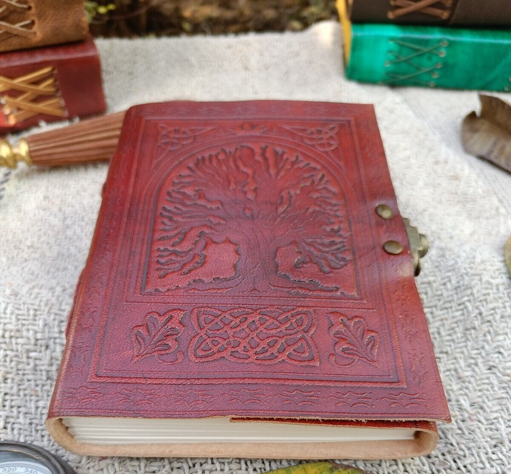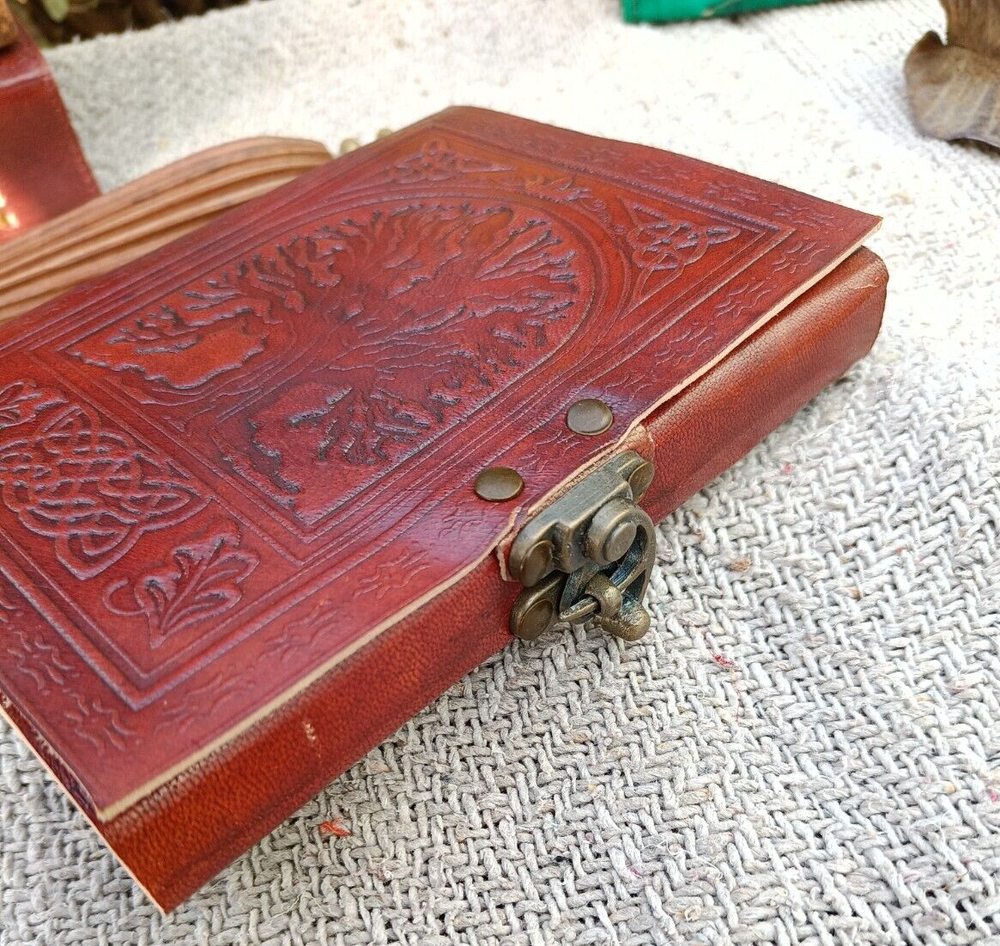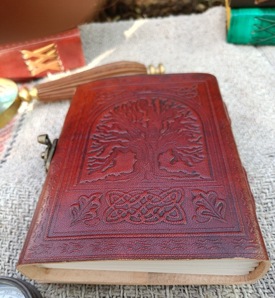 THIS HAS A LOT OF CHARACTER AND VERY HIGH QUALITY CLOSES WITH BRASS C-LOCK GENUINE BROWN LEATHER WITH TREE DESIGN ON THE FRONT ( SHADE MAY VARY ) SIZE : 4 INCHES WIDE BY 6 INCHES HIGH AND 1 INCH DEEP AT LEAST 200 PAGES (counting both side) NATURAL PAPER WITH UNBLEACHED PULP