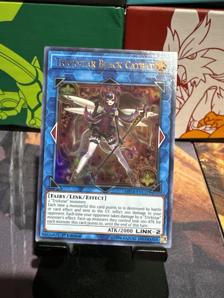 This is an Ultra Rare 1st Edition Trickstar Black Catbat card from the 2018 Mega-Tins Pack of the Yu-Gi-Oh! TCG game. The card number is MP18-EN132 and it is a Monster card type. The card features the iconic black cat and the trickster archetype, making it a must-have for collectors and players alike. The card is in excellent shape, with no visible damage or wear. It is perfect for adding to your collection or using in competitive play. Don't miss your chance to own this rare and sought-after card.