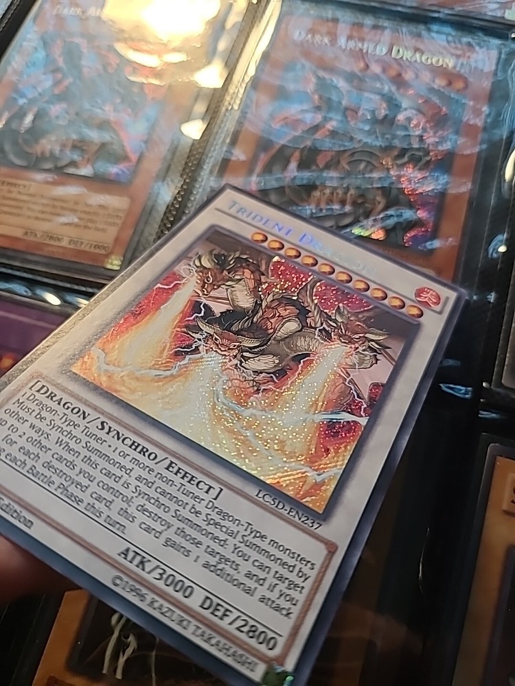 The Trident Dragion LC5D-EN237 is a Secret Rare card from the Legendary Collection 5D's set of the Yu-Gi-Oh! TCG. It is an Effect/Synchro type card with an attack power of 3000 and a defense toughness of 2800. The card features the creature/monster type Dragon and has the attribute/MTG color Fire. The card is in its 1st Edition and is manufactured by Konami.