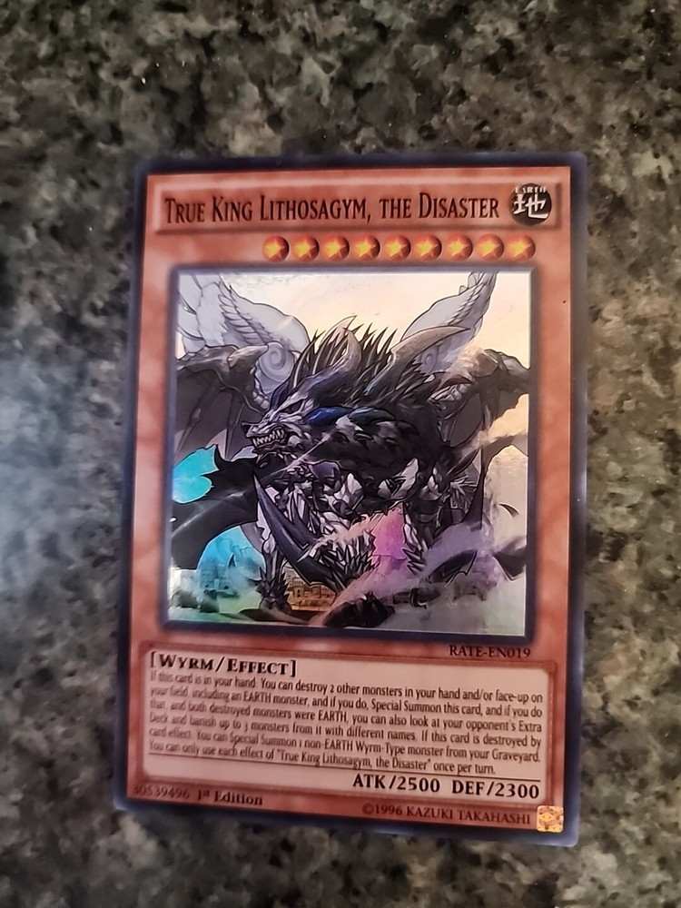 This Yu-Gi-Oh! TCG card is a must-have for any collector or player. The True King Lithosagym, the Disaster card is a rare find and is in near mint or better condition. This card is ungraded and is a 1st edition, making it a valuable addition to any collection. Recommended for ages 7+ years, this card is suitable for both boys and girls who are fans of the Yu-Gi-Oh! franchise. This card belongs to the Yu-Gi-Oh character family and is perfect for collectors of CCG individual cards. Don't miss out on the opportunity to own this rare and valuable card.