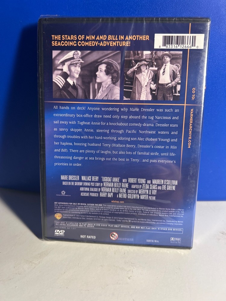 Further Details Title: Tugboat Annie Format: DVD Condition: New Number Of Discs: 1 Release Date: 06/22/2009 Genre: Comedy Actors: Marie Dressler, Robert Young, Wallace Beery Director: Mervyn Leroy Audio Language: Unqualified Runtime: 88:00 Region Code: DVD: 1 (US, Canada...) Studio: Warner Archive Certificate: MPAA Not Rated Description: All hands on deck! Anyone wondering why Marie Dressler was such an extraordinary box-office draw need only to step aboard the tug Narcissus and sail away with Tugboat Annie for a knockabout comedy-drama. Dressler stars as savvy skipper Annie, steering through Pacific Northwest waters and through troubles with her hard-working, adoring son Alec (Robert Young) and her hapless, boozing husband Terry (Wallace Beery, Dressler's costar in Min and Bill). There are plenty of laughs, but also lots of familial strife, until life-threatening danger at sea brings out the best in Terry and puts everyone's priorities in order. Aspect Ratio: 4 X 3 FULL FRAME, Original Aspect Ratio - 1.33 Audio Format: Mono 1.0 - English Color / Black & White: Special Features: DVDs ARE REGION 1 UNLESS OTHERWISE STATED Missing Information? Please contact us if any details are missing and where possible we will add the information to our listing.