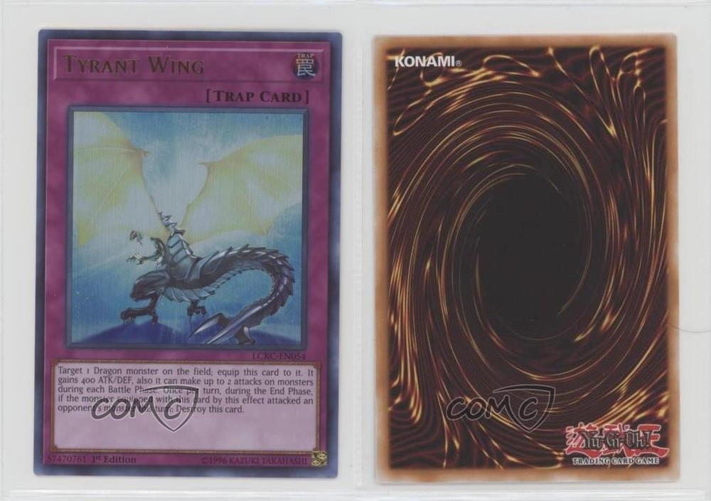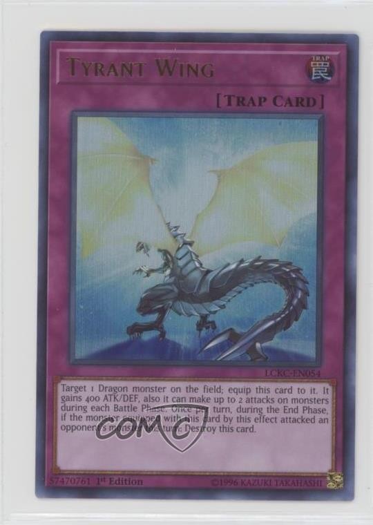 2018 Yu-Gi-Oh! - Legendary Collection Kaiba - [Base] - 1st Edition #LCKC-EN054 Ultra Rare - Tyrant Wing COMC Item: 172330214 - YuGiOh Card - Featuring Tyrant Wing Search for more: 2018 Yu-Gi-Oh! - Legendary Collection Kaiba Search for more: 2018 Yu-Gi-Oh! - Legendary Collection Kaiba - [Base] - 1st Edition View all of our Listings Auctions Buy It Now About Us Located in the beautiful Pacific Northwest, COMC (Check Out My Cards) is the world's largest consignment service for trading card singles. More than 10,000 people have used our consignment service to list over 50 million trading cards. Find out how we can help you consign your items on eBay by contacting us through eBay messaging. COMC -- "The Safe & Easy Way to Buy & Sell" Raw Condition for Modern Cards Unless otherwise noted, raw modern cards are listed in Near Mint-Mint condition or better. A NM-MT card appears to be Mint at first glance, but upon closer inspection, may exhibit some of the following: minor print defects (e.g. roller marks, print line, dimple), minor scratches, slight edge wear, and slight corner wear. Centering is clearly visible in the images provided and does not factor into our condition assessment. Raw Condition for Vintage Cards Unless otherwise noted, raw vintage cards are listed in Excellent condition or better. An EX card may exhibit some of the following: minor rounding of corners, surface wear, print defects, light scratches, and slight edge wear/chipping. Centering is clearly visible in the images provided and does not factor into our condition assessment. Domestic Shipping Combined shipping for multiple items is available. To receive combined shipping, please ensure all desired items are in your eBay shopping cart before proceeding to checkout. eBay limits orders to 40 items per order. We automatically combine multiple orders placed on the same day. If you place multiple orders on the same day, please contact us to request a refund of applicable shipping costs. Signature confirmation may be required on invoices over $400. All cards are protected and shipped securely. International Shipping COMC offers eBay's International Shipping (EIS) for international orders under $2,500* (see country exceptions below). All duties and import fees are paid at checkout; in the rare event that there are additional import fees upon delivery, these are borne by the buyer. EIS packages route through a shipping hub in Erlanger, KY before shipping to their final destination. Please note that EIS does not allow for combined shipments. The shipping rates are determined by eBay and cannot be adjusted. *Maximum sale price exceptions: Colombia, Kuwait ($2,000); Taiwan ($1,539); Chile, Costa Rica, Guatemala, Honduras, Trinidad and Tobago ($1,000); Antigua and Barbuda, Aruba, Belize, Dominica, Grenada, Philippines, Saint Kitts and Nevis, Saint Lucia, Montserrat, Turks and Caicos Islands ($500); Dominican Republic, El Salvador ($200). Please request a shipping quote through eBay messaging for orders that exceed the maximum sale price supported by eBay's International Shipping. You will be responsible for all duties and import fees for international orders shipped outside the EIS. All cards are protected and shipped securely. Payment COMC does not accept offers on our cards through our eBay storefront. COMC utilizes eBay’s managed payments system. If you are experiencing difficulties making a payment, please contact eBay for assistance. Return Policy Returns are only accepted on the rare occasion the item is not as described. If you are making a return, please initiate the return process through eBay so a mailing label can be provided for you. Prior to listing, our expert team carefully assessed this item to represent it accurately. Please review the description and high-definition images prior to purchasing to ensure this item meets your satisfaction. We welcome you to contact us if you have further questions about this item. Trust and Integrity COMC carefully assesses each item consigned to us to prevent fraudulent items from entering the marketplace. If you believe an item offered on COMC may be fraudulent, please contact us with details so we can investigate the issue. Items we determine are outside our supported items policy may be removed. Last Modified: 6/5/2025 5:44:55 PM PDT
