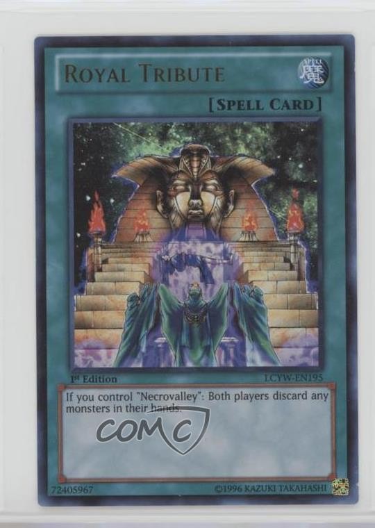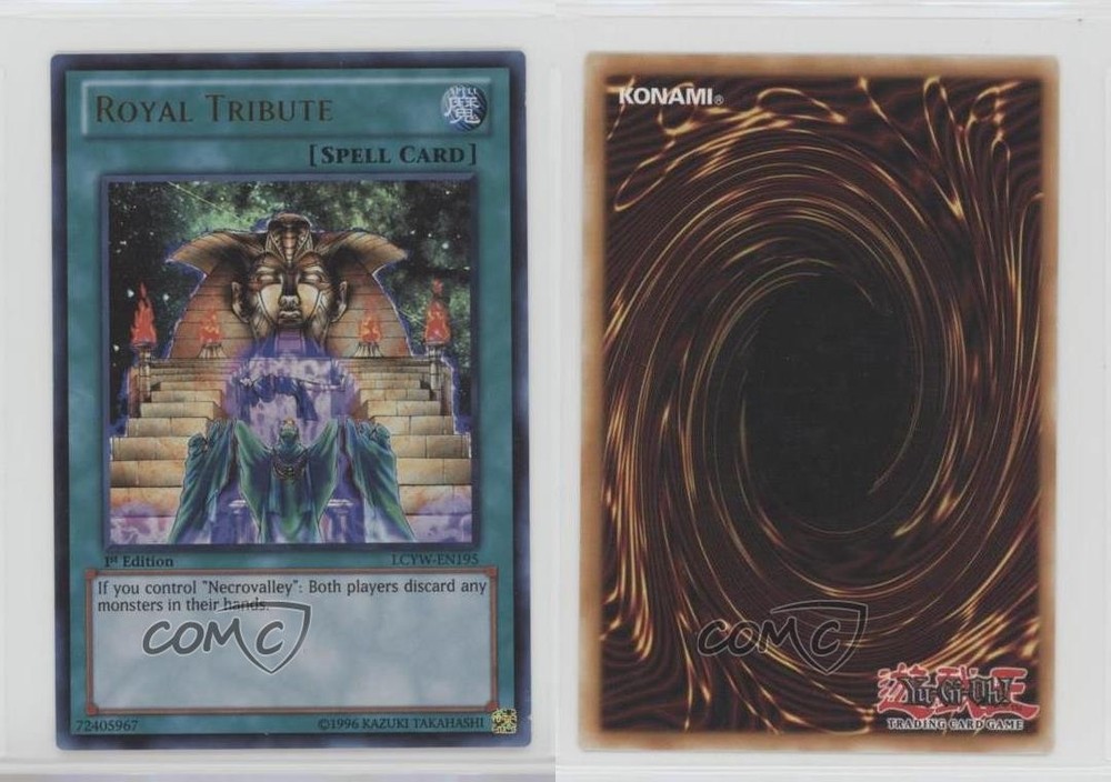2012 Yu-Gi-Oh! Legendary Collection 3: Yugi's World - Mega-Pack [Base] - 1st Edition #LCYW-EN195 UR - Royal Tribute COMC Item: 93719230 - YuGiOh Card - Featuring Royal Tribute Search for more: 2012 Yu-Gi-Oh! Legendary Collection 3: Yugi's World Search for more: 2012 Yu-Gi-Oh! Legendary Collection 3: Yugi's World - Mega-Pack [Base] - 1st Edition View all of our Listings Auctions Buy It Now About Us Located in the beautiful Pacific Northwest, COMC (Check Out My Cards) is the world's largest consignment service for trading card singles. More than 10,000 people have used our consignment service to list over 50 million trading cards. Find out how we can help you consign your items on eBay by contacting us through eBay messaging. COMC -- "The Safe & Easy Way to Buy & Sell" Raw Condition for Modern Cards Unless otherwise noted, raw modern cards are listed in Near Mint-Mint condition or better. A NM-MT card appears to be Mint at first glance, but upon closer inspection, may exhibit some of the following: minor print defects (e.g. roller marks, print line, dimple), minor scratches, slight edge wear, and slight corner wear. Centering is clearly visible in the images provided and does not factor into our condition assessment. Raw Condition for Vintage Cards Unless otherwise noted, raw vintage cards are listed in Excellent condition or better. An EX card may exhibit some of the following: minor rounding of corners, surface wear, print defects, light scratches, and slight edge wear/chipping. Centering is clearly visible in the images provided and does not factor into our condition assessment. Domestic Shipping Combined shipping for multiple items is available. To receive combined shipping, please ensure all desired items are in your eBay shopping cart before proceeding to checkout. eBay limits orders to 40 items per order. We automatically combine multiple orders placed on the same day. If you place multiple orders on the same day, please contact us to request a refund of applicable shipping costs. Signature confirmation may be required on invoices over $400. All cards are protected and shipped securely. International Shipping COMC offers eBay's International Shipping (EIS) for international orders under $2,500* (see country exceptions below). All duties and import fees are paid at checkout; in the rare event that there are additional import fees upon delivery, these are borne by the buyer. EIS packages route through a shipping hub in Erlanger, KY before shipping to their final destination. Please note that EIS does not allow for combined shipments. The shipping rates are determined by eBay and cannot be adjusted. *Maximum sale price exceptions: Colombia, Kuwait ($2,000); Taiwan ($1,539); Chile, Costa Rica, Guatemala, Honduras, Trinidad and Tobago ($1,000); Antigua and Barbuda, Aruba, Belize, Dominica, Grenada, Philippines, Saint Kitts and Nevis, Saint Lucia, Montserrat, Turks and Caicos Islands ($500); Dominican Republic, El Salvador ($200). Please request a shipping quote through eBay messaging for orders that exceed the maximum sale price supported by eBay's International Shipping. You will be responsible for all duties and import fees for international orders shipped outside the EIS. All cards are protected and shipped securely. Payment COMC does not accept offers on our cards through our eBay storefront. COMC utilizes eBay’s managed payments system. If you are experiencing difficulties making a payment, please contact eBay for assistance. Return Policy Returns are only accepted on the rare occasion the item is not as described. If you are making a return, please initiate the return process through eBay so a mailing label can be provided for you. Prior to listing, our expert team carefully assessed this item to represent it accurately. Please review the description and high-definition images prior to purchasing to ensure this item meets your satisfaction. We welcome you to contact us if you have further questions about this item. Trust and Integrity COMC carefully assesses each item consigned to us to prevent fraudulent items from entering the marketplace. If you believe an item offered on COMC may be fraudulent, please contact us with details so we can investigate the issue. Items we determine are outside our supported items policy may be removed. Last Modified: 6/9/2025 6:12:41 PM PDT